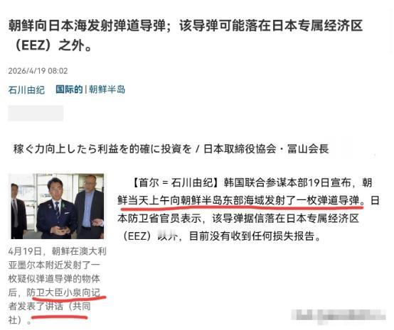 4月19日,根据日本产经新闻报道,日媒称,朝鲜当天上午向朝鲜半岛东部海域发射了一枚弹道导弹。日本防卫省官员表示,该导弹据信落在日本专属经济区以外,目前没有收到任何损失报告。