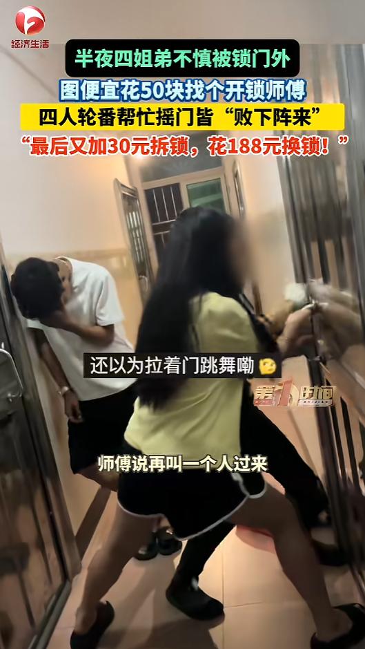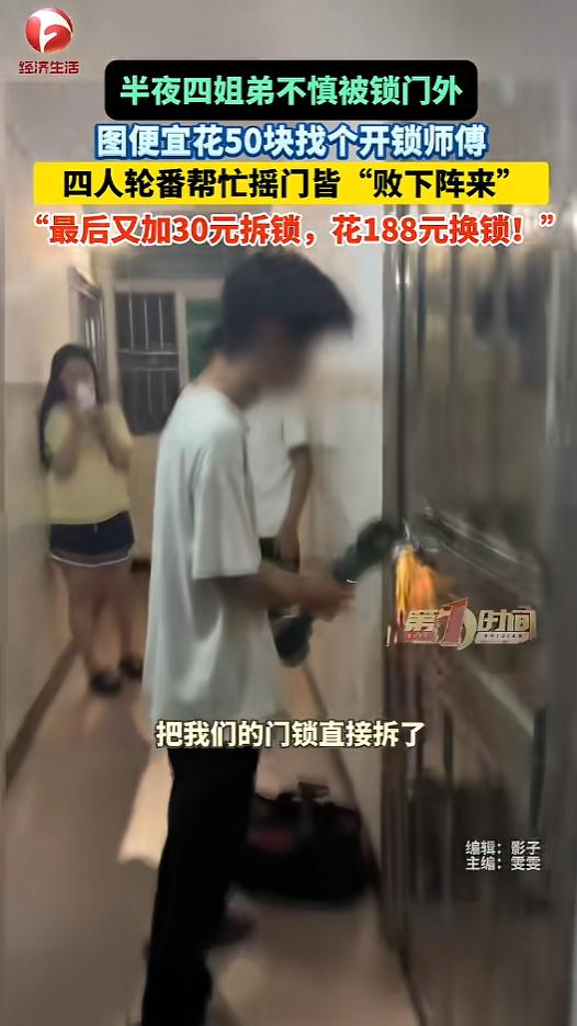 “贪小便宜吃大亏!”4月16日,广东惠州,姐弟四人半夜出门,被锁在了门外。她们一看开锁要100块钱,就灵机一动,找了地摊上配钥匙的老板,只要50块。可试了半天都没成功,又加了30,找了个祖传的,结果直接把锁切掉了!