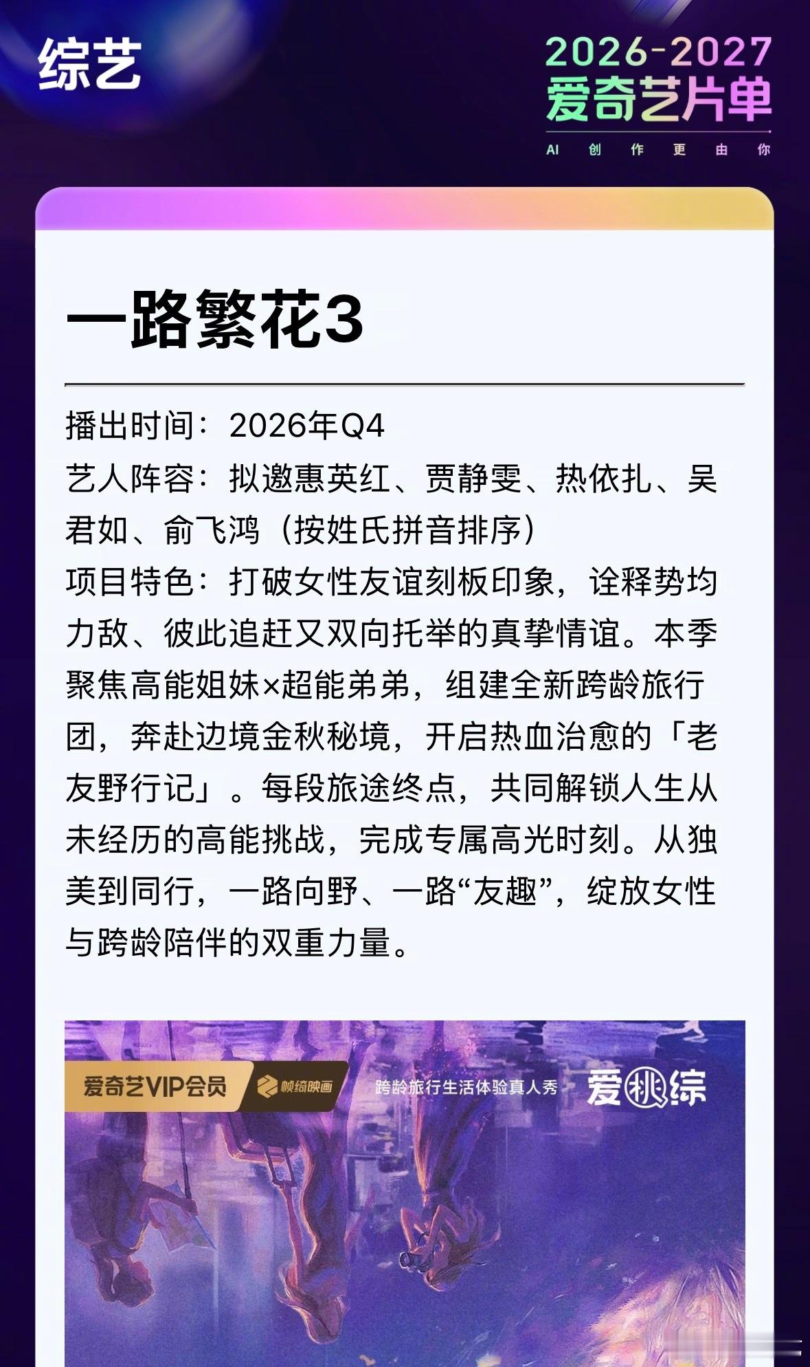 一路繁花3拟邀阵容一路繁花3拟邀吴君如今日爱奇艺世界大会上官宣了综艺《一路繁花3》,拟邀拟邀惠英红、贾静雯、热依扎、吴君如、俞飞鸿(按姓氏拼音排序)。本季聚焦高能姐妹×超能弟弟,组建全新跨龄旅行团,奔赴边境金秋秘境,开启热血治愈的「老友野行记」。每段旅途终点,共同解锁人生从未经历的高能挑战,完成专属高光时刻。爱奇艺综艺全面夯爆