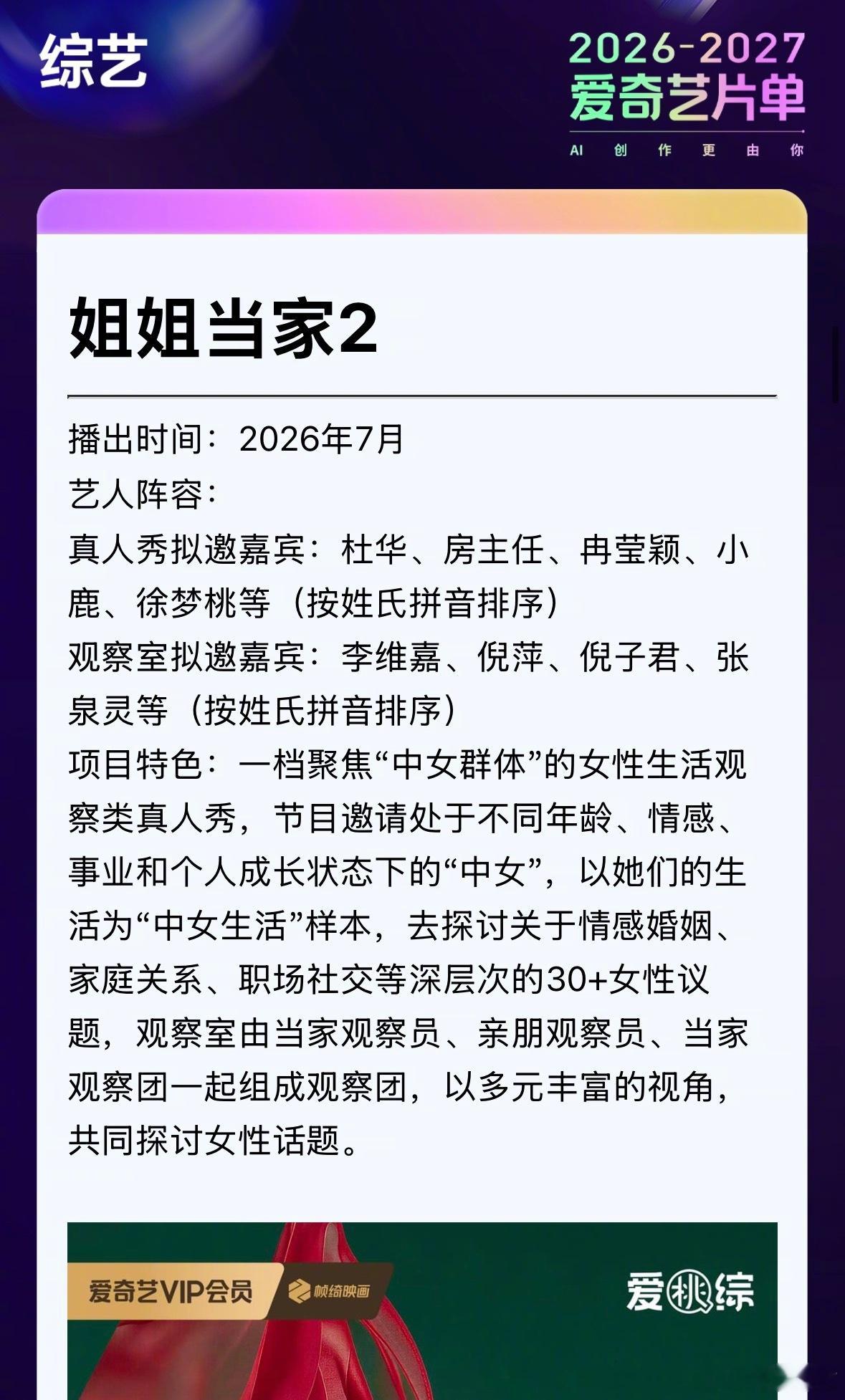 杜华加盟姐姐当家2杜华要上真人秀了今日爱奇艺世界大会上官宣了综艺《姐姐当家2》,拟邀杜华、房主任、冉莹颖、小鹿、徐梦桃等(按姓氏拼音排序),节目邀请处于不同年龄、情感、事业和个人成长状态下的“中女”,以她们的生活为“中女生活”样本,去探讨关于情感婚姻、家庭关系、职场社交等深层次的30+女性议题。爱奇艺综艺全面夯爆