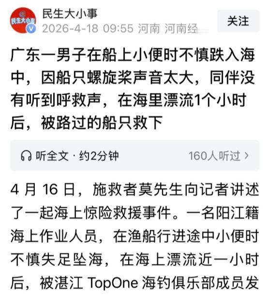 近日,广东阳江海域,一名浑身湿透的渔民被人从海里救起,此时他已经在海上漂流了整整1小时,呛进了大量海水,体力彻底虚脱,脸色苍白得吓人,连抬手的力气都没有。谁能想到,这场差点致命的意外,竟只是因为一次随手的小便。