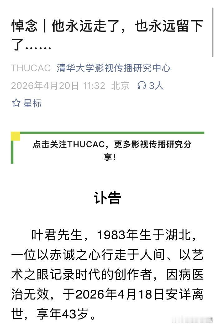 我在故宫修文物导演叶君去世 20日,清华大学影视传播研究中心发布讣告称,叶君因病医治无效,于2026年4月18日安详离世,享年43岁。叶君曾执导过纪录片《我在故宫修文物》,参与编导《如果国宝会说话》。