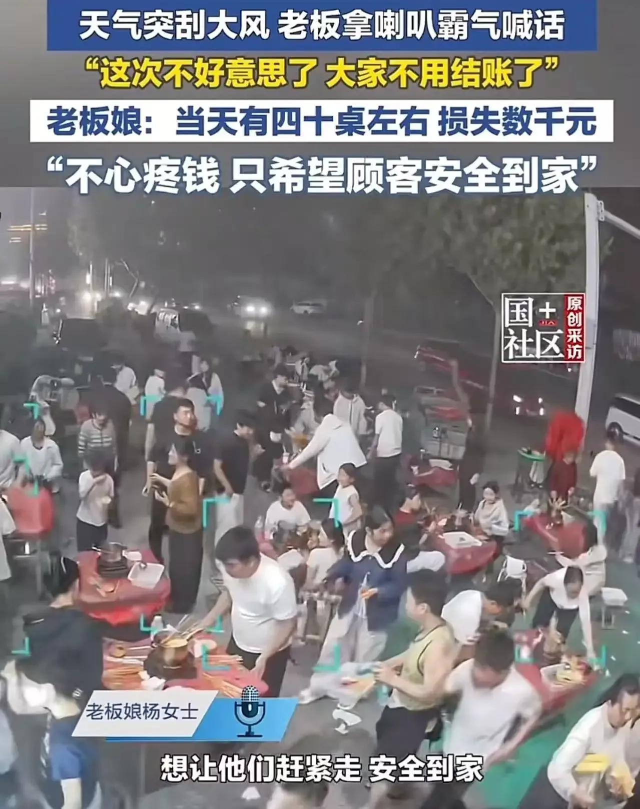 在山东菏泽的一个露天夜宵摊,天气突然刮起了大风,顾客们正吃得津津有味,却突然被这突如其来的天气打乱了节奏。就在大家刚想抱怨没法继续吃的时候,老板老杨却做出了一个让人惊呆的举动。他举着喇叭,站在风里大声喊话:“所有朋友!听我说!今天这顿饭,不用结账了!大家都别吃了,赶紧回家!不好意思了各位,安全第一,快走吧!”这霸气又暖心的喊话,让在场的顾客们瞬间感动不已。有网友表示,这个老板太会做人,更会做生意。他不仅考虑到了顾客的安全,还免去了当晚的餐费,这样的举动无疑让在场的每一个人都感受到了温暖和尊重。可以想象,凡是今晚在场的人,心里都会感动,他们也一定会介绍更多的朋友来光顾这家夜宵摊。
