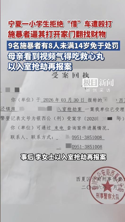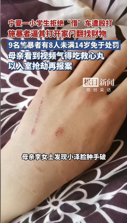 信息来源:《宁夏一小学生拒绝“借”车遭殴打,施暴者逼其打开家门翻找财物,9名施暴者有8人未满14岁免于处罚,母亲看到视频气得吃救心丸,以入室抢劫再报案》极目新闻