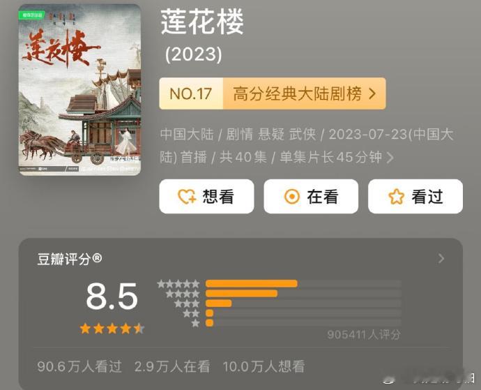《莲花楼》全网400亿播放、抖音300亿话题、爱奇艺9.4分断层第一,三年霸榜、