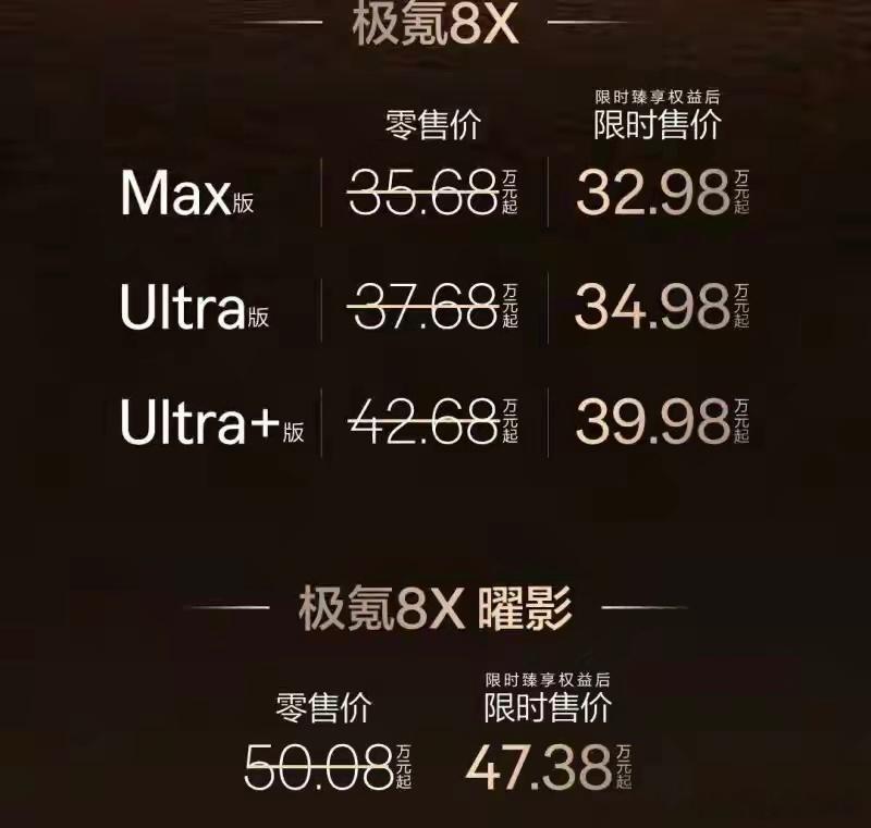 【极氪8X上市32.98万起】4月18日,极氪8X上市,限时价32.98万起,定位30万+中大型豪华纯电SUV,搭载双Orin-X芯片、3颗激光雷达,标配空气悬架、CDC减震,对标蔚来ES8等车型。极氪依托吉利造车底蕴,以操控、豪华、智能为核心卖点,快速在高端市场站稳脚跟,极氪8X是其冲击高端市场的重磅车型。当下30万+豪华纯电市场已成红海,产品同质化严重,竞争异常激烈。极氪8X虽产品力过硬,但仍面临巨大竞争压力,如何在众多竞品中脱颖而出,抢占用户心智,突破品牌壁垒,是其亟需解决的问题。这款车型的市场表现,或许也将直接影响极氪高端化布局的成败。