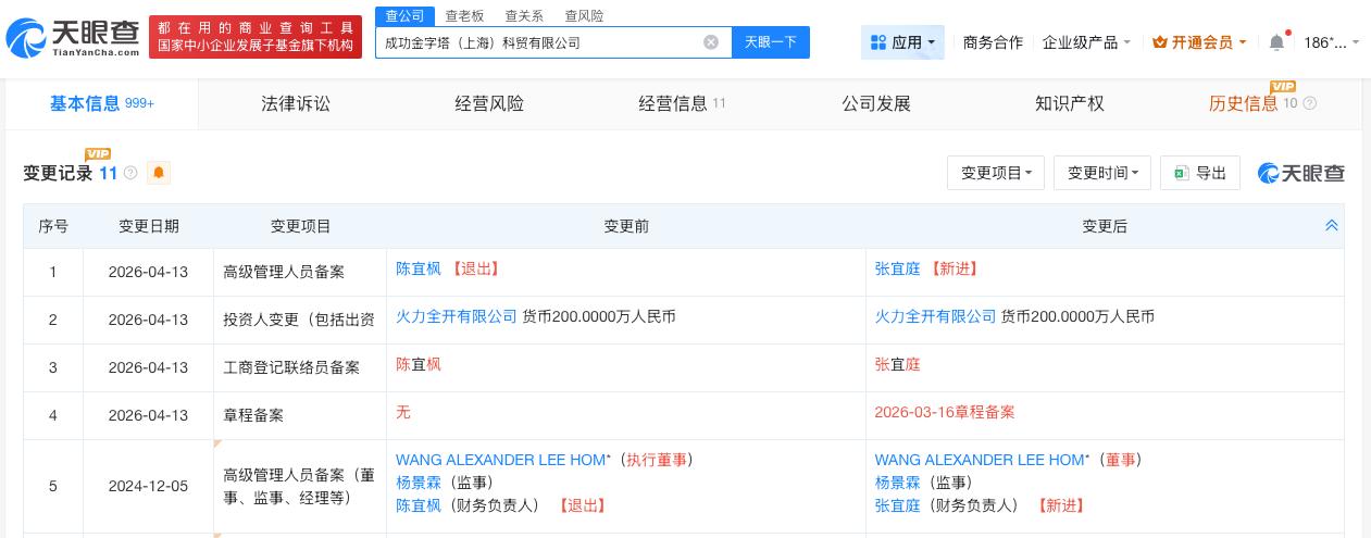 天眼查App显示,4月13日,成功金字塔(上海)科贸有限公司发生高管变更,陈宜枫退出,由张宜庭接任。