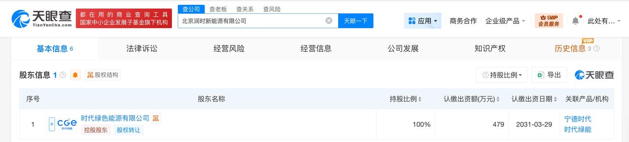 天眼查工商信息显示,近日,北京润时新能源有限公司成立,法定代表人为戴维,注册资本479万人民币,经营范围包括发电业务、输电业务、供(配)电业务、建设工程施工等。股东信息显示,该公司由宁德时代旗下时代绿色能源有限公司全资持股。