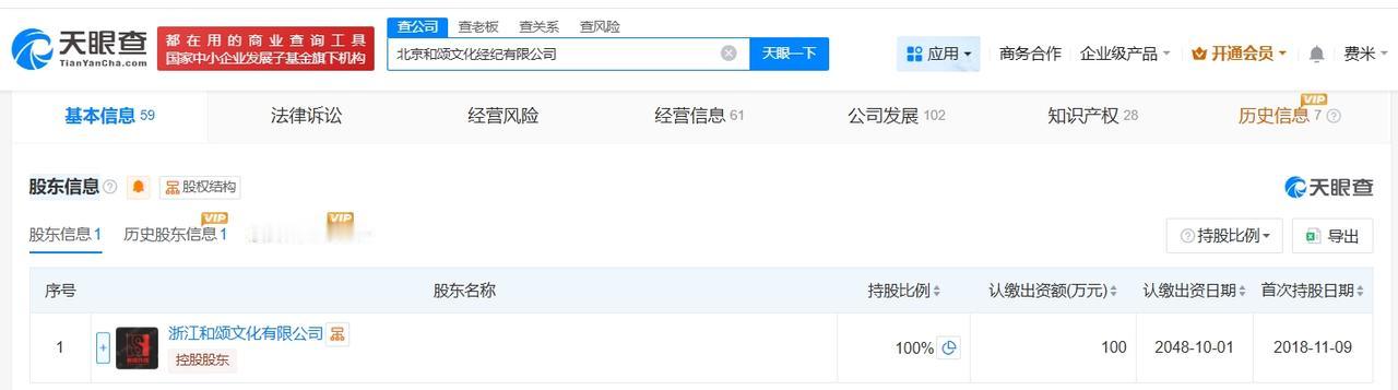 天眼查App显示,何润东经纪公司北京和颂文化经纪有限公司成立于2018年11月,法定代表人为李冬雪,注册资本100万人民币,经营范围包括文化娱乐经纪人服务、演出经纪、营业性演出等,由浙江和颂文化有限公司全资持股。