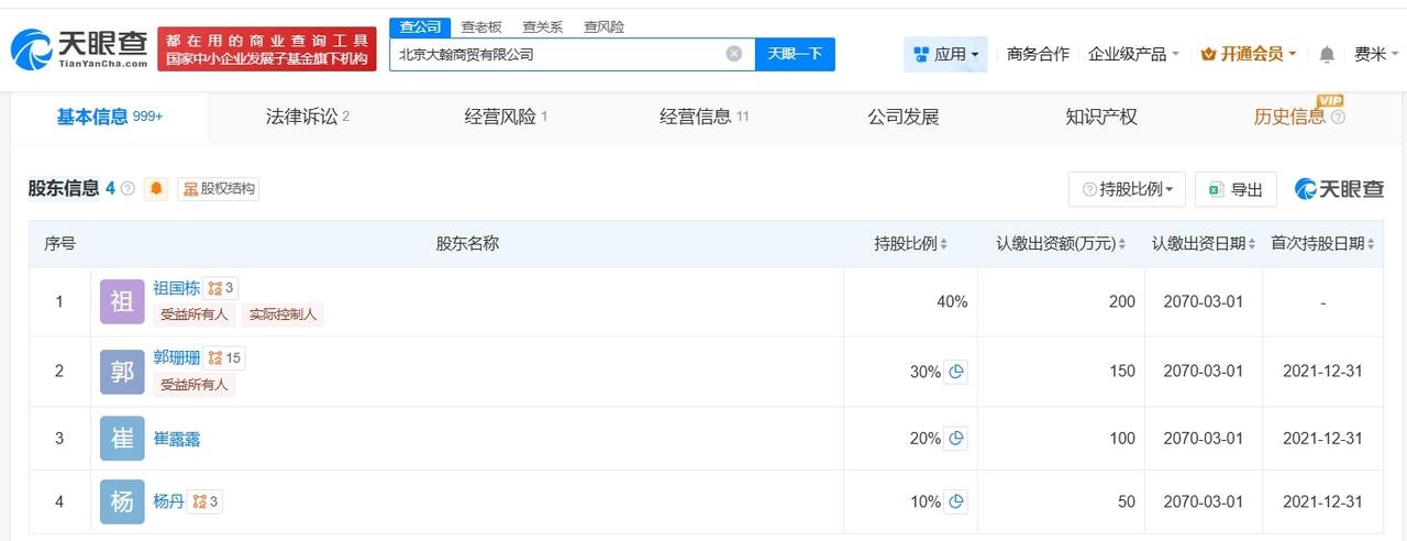 该公司成立于2021年3月,注册资本500万人民币,经营范围包括食品经营、租赁建筑机械设备、烟草制品零售等,由祖国栋、嘎子哥妻子郭珊珊等共同持股。