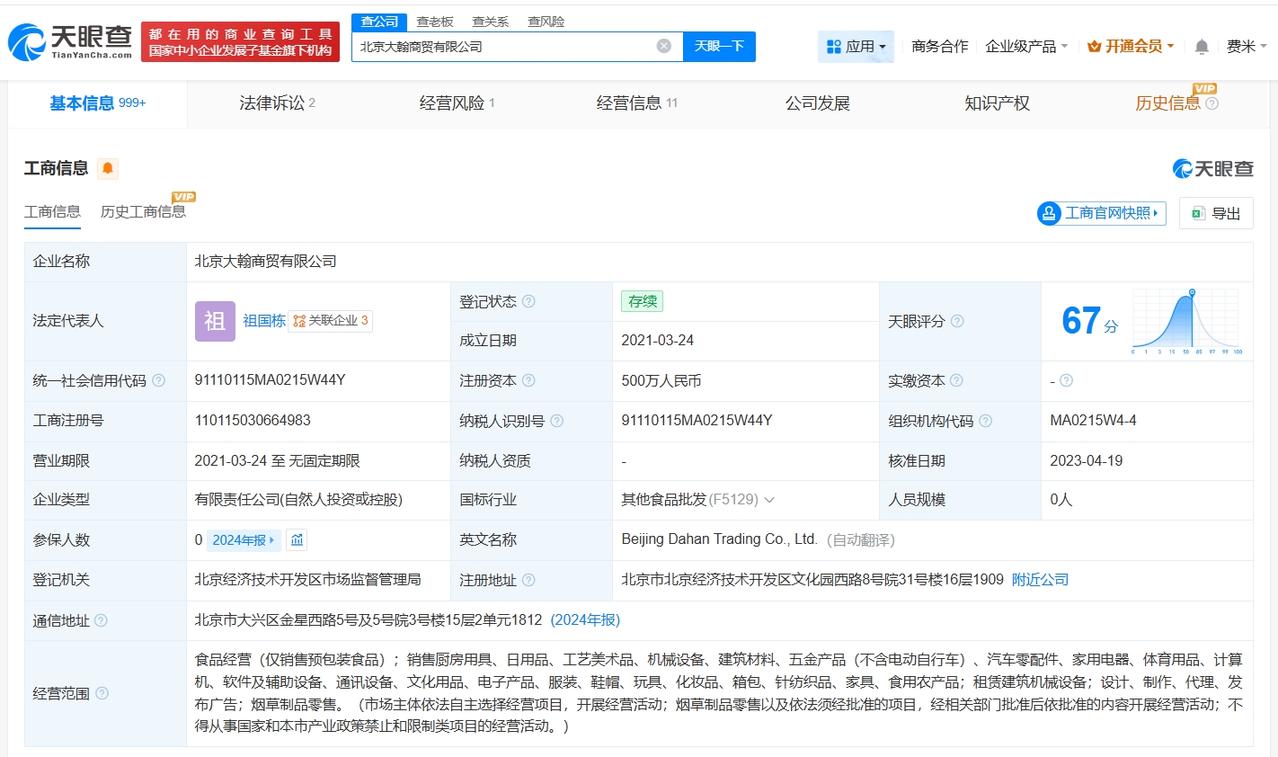 天眼查法律诉讼信息显示,近日,北京大翰商贸有限公司及其法定代表人祖国栋新增一则限制消费令,执行法院为北京市大兴区人民法院,案件流程信息显示,此前,该公司已因此案被执行1399万余元。