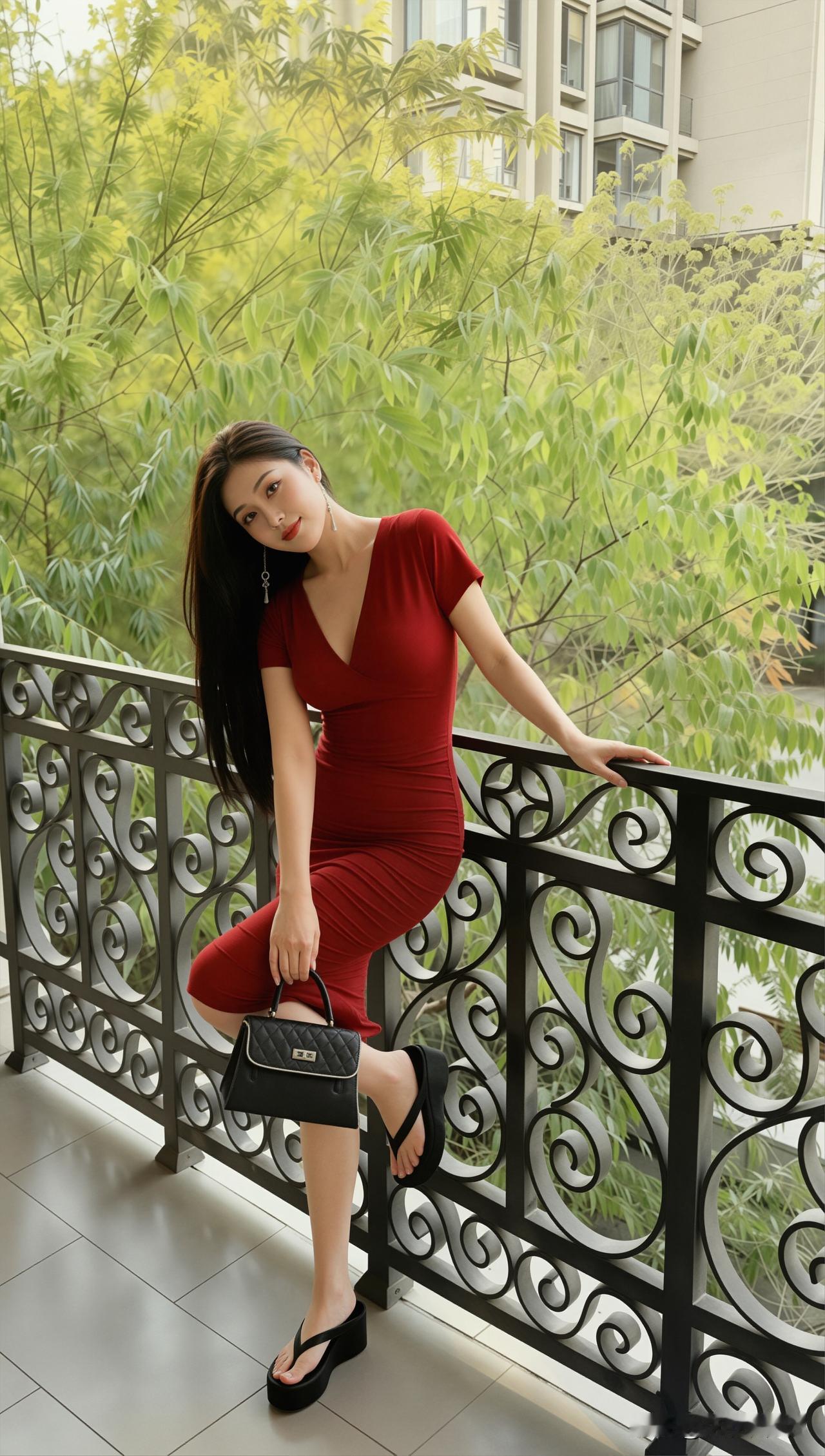 午后的阳光穿过阳台的铁艺栏杆,在光洁的地面上投下斑驳的影子。她身着一袭酒红色的修身连衣裙,像一团沉静的火焰,点燃了这方被绿意环绕的角落。