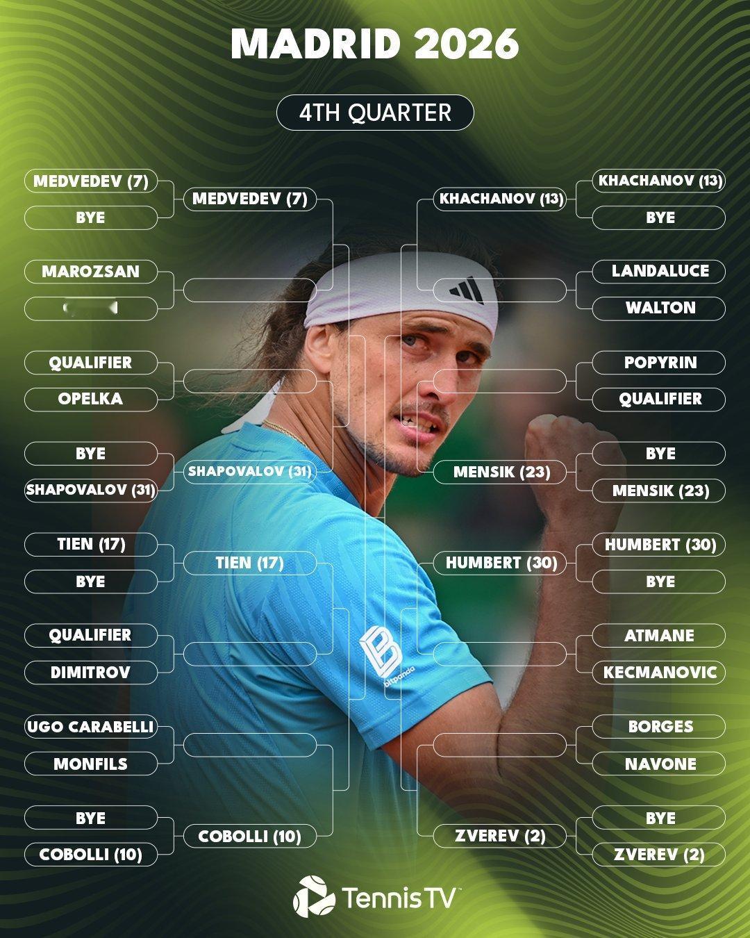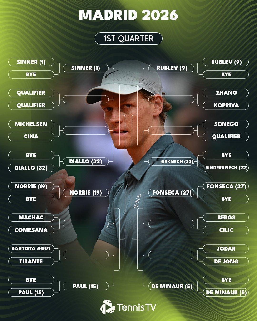 2026赛季ATP马德里大师赛公布男单正赛签表,中国选手张之臻首轮迎战科普里瓦,次轮对位卢布列夫,辛纳领衔出战力争大师赛五连冠,冲击成为历史第一人🔥