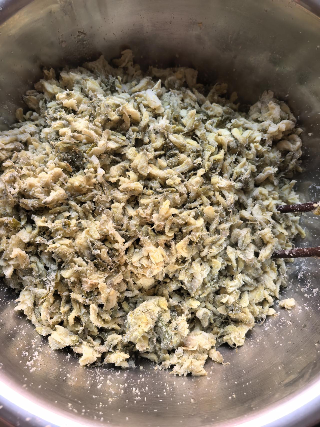 我每次将要蒸的菜择洗干净后,最快的沥水办法就是放包袱里,然后甩开膀子抡上几圈后,倒入一个大点的盆里,先倒入色拉油用手拌匀,再放入五香粉和咸盐,最后放面粉,少量多次的,直到粒粒分明便大功告成。