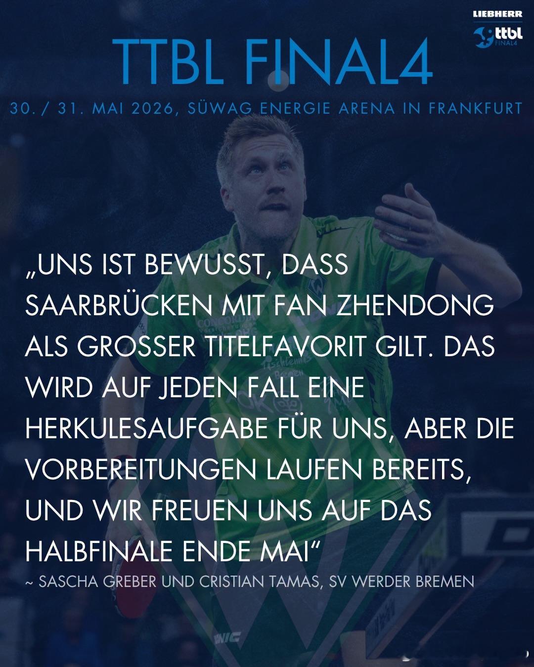 4. 云达不莱梅队教练组 萨沙·格雷贝尔 & 克里斯蒂安·塔马斯“我们很清楚,拥有樊振东的萨尔布吕肯是夺冠的头号热门。这对我们来说无疑是一项艰巨的挑战,但我们已经在备战了,也很期待五月底的这场半决赛。”
