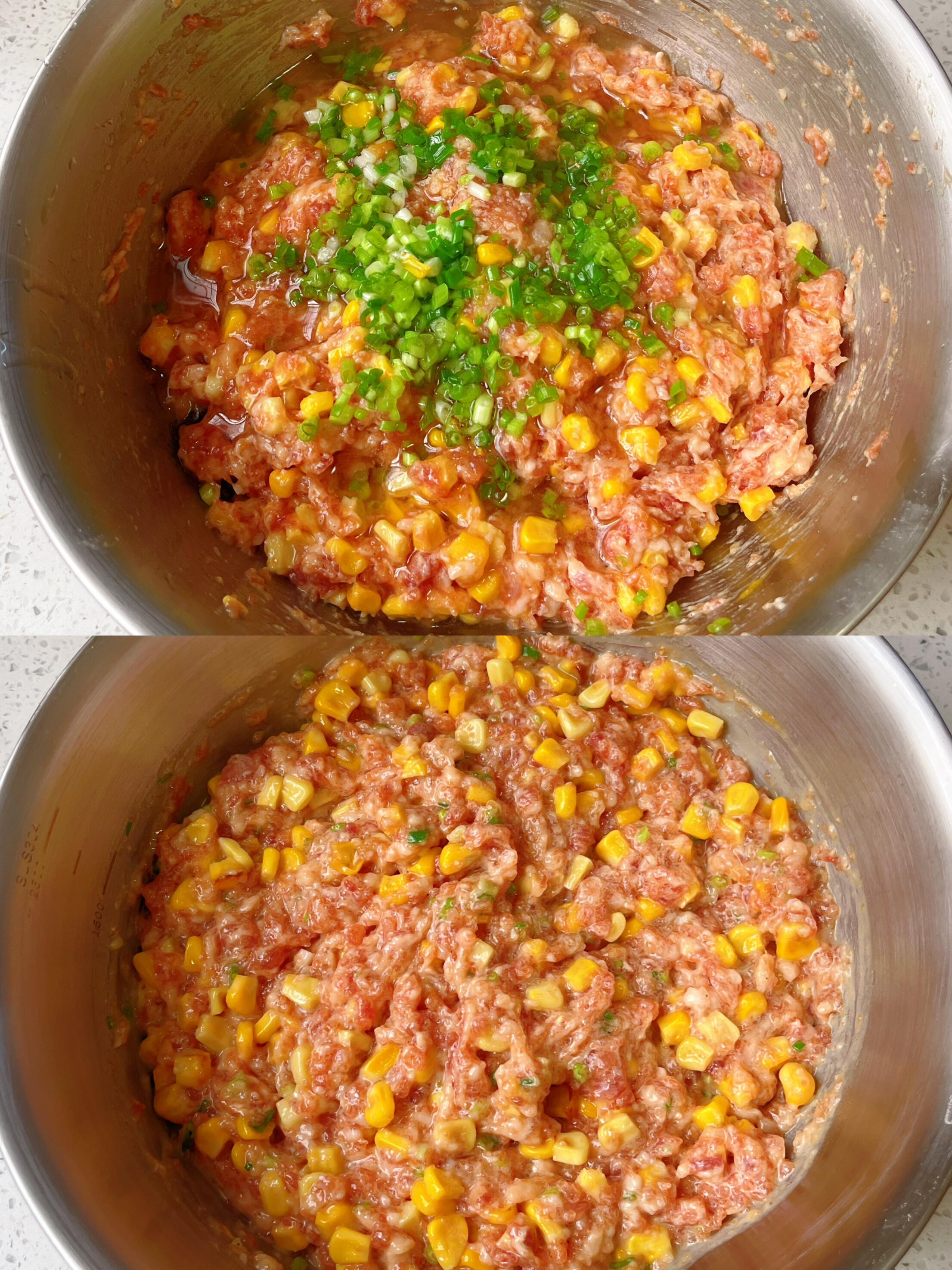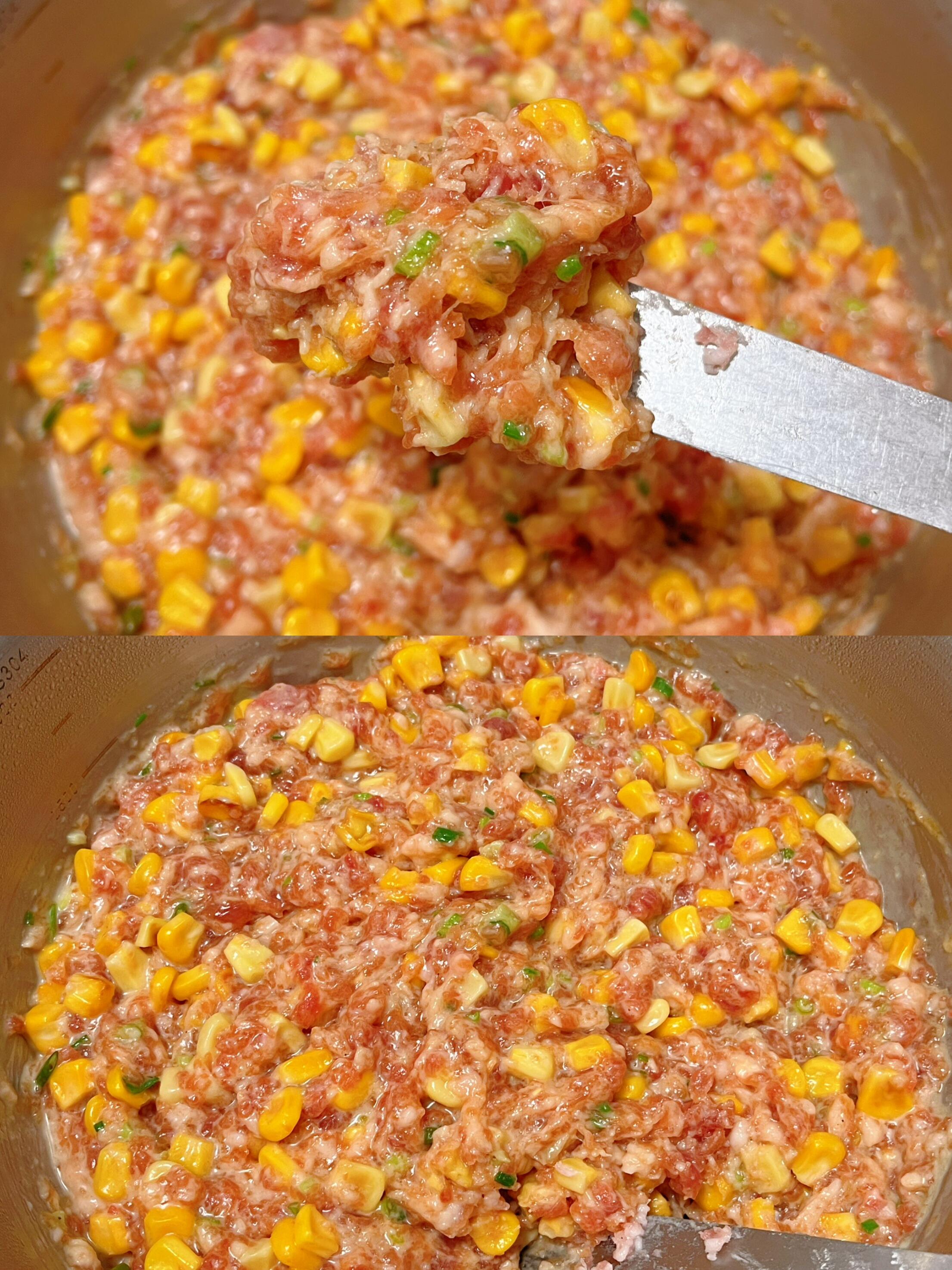 3. 混合玉米:玉米剥粒,放入锅中翻炒至断生(不用炒太久,保留清甜口感),放凉后倒入肉馅中,继续朝一个方向搅拌均匀,让玉米和肉馅充分融合。