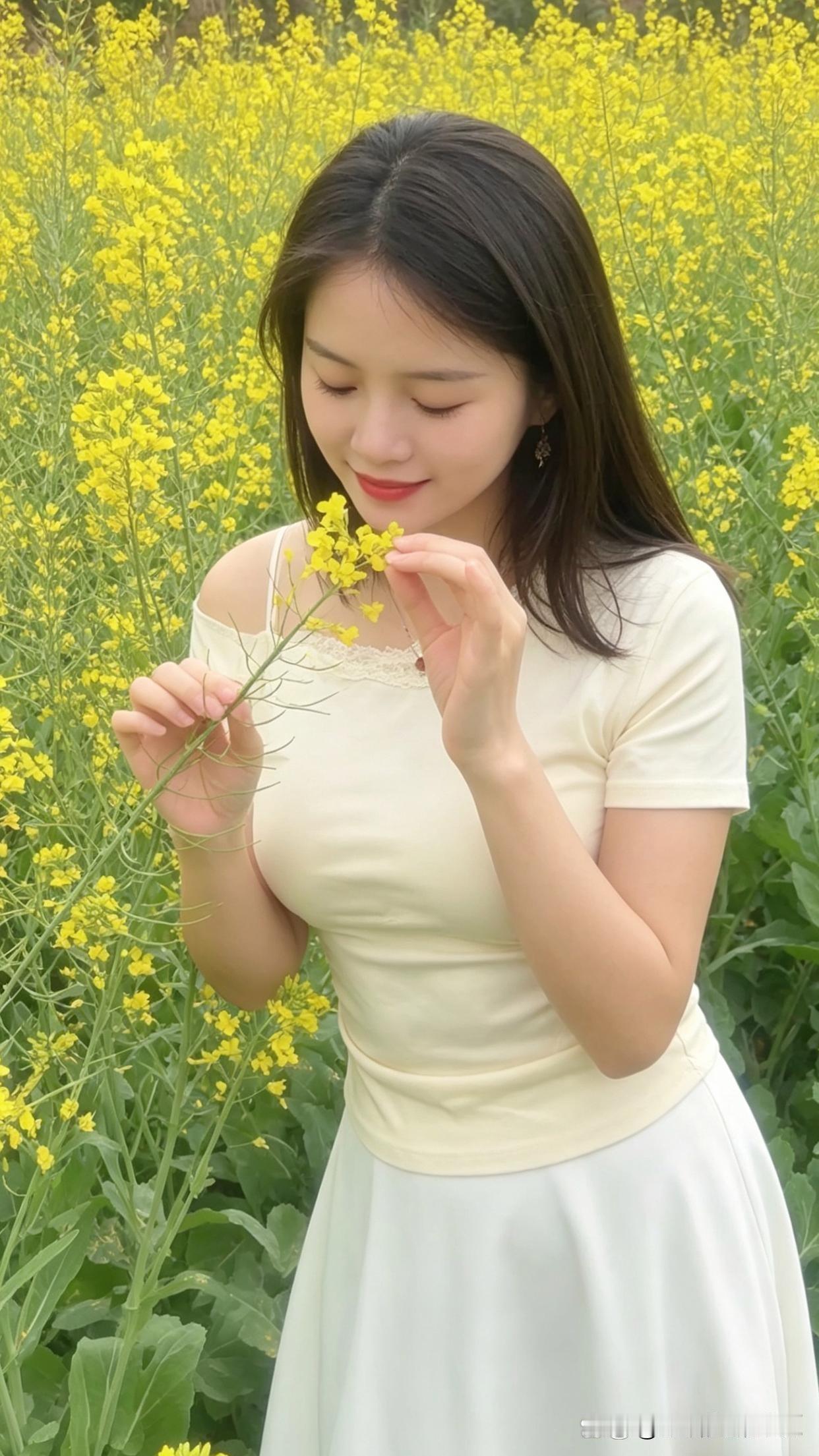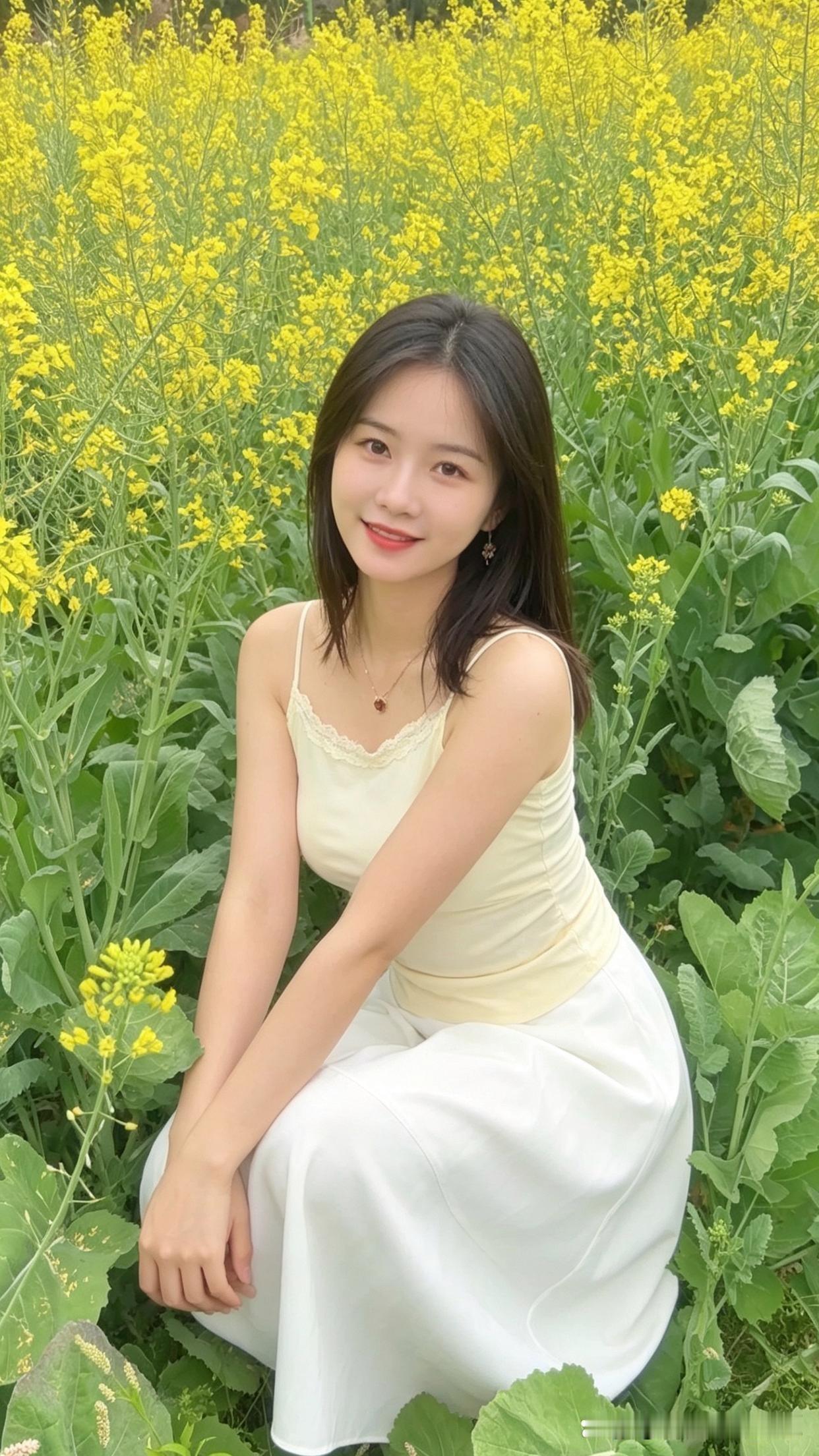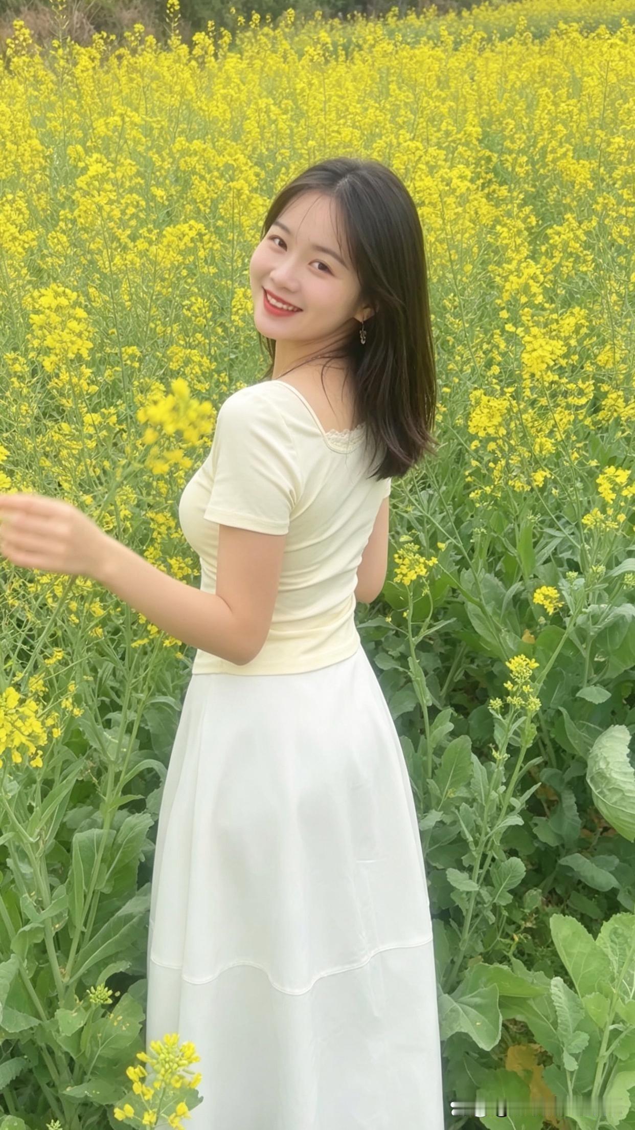 春日花海,是甜美少女的天然舞台。瞧那身着白裙的她,在花丛中笑靥如花,长发随风轻扬