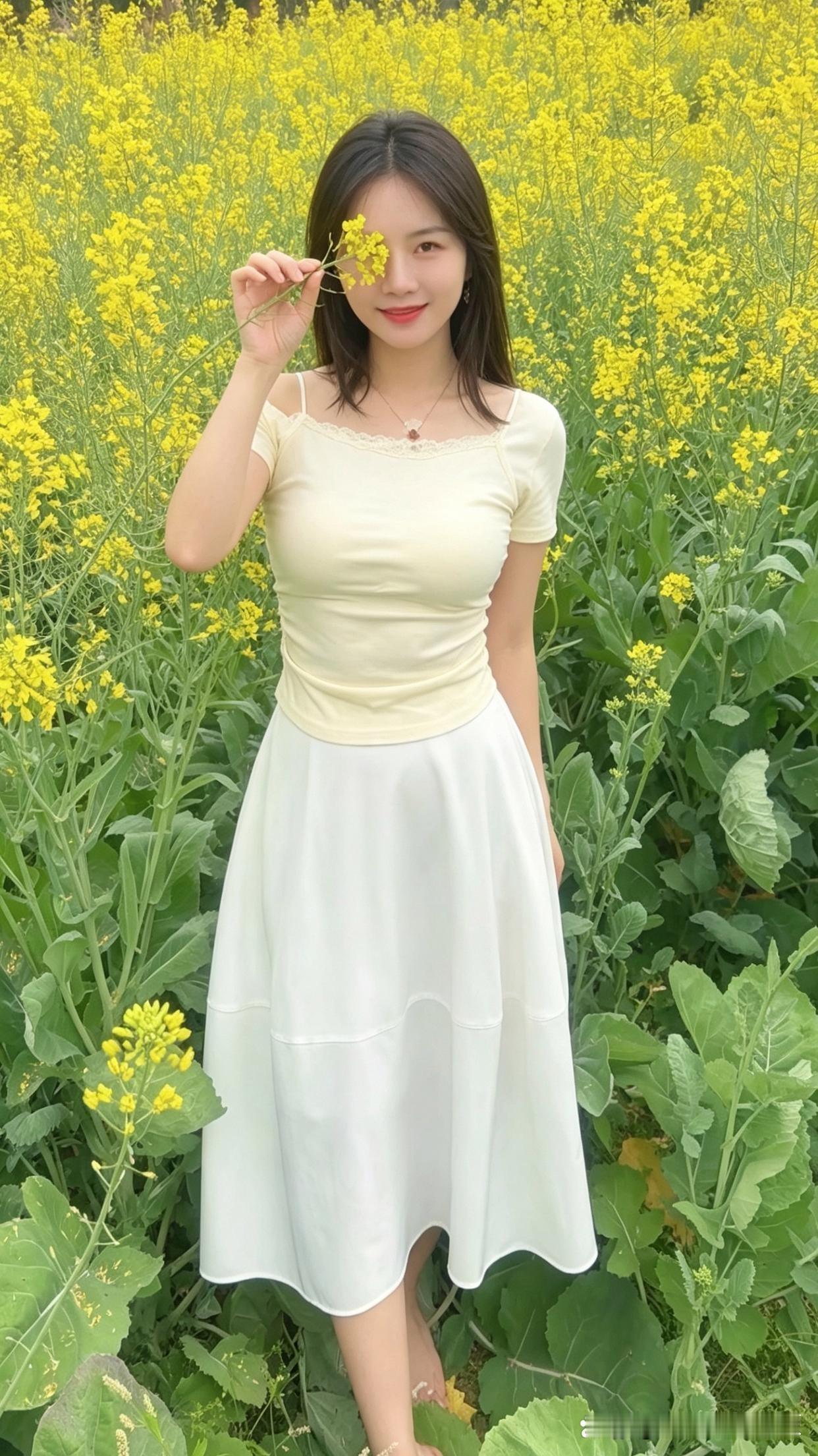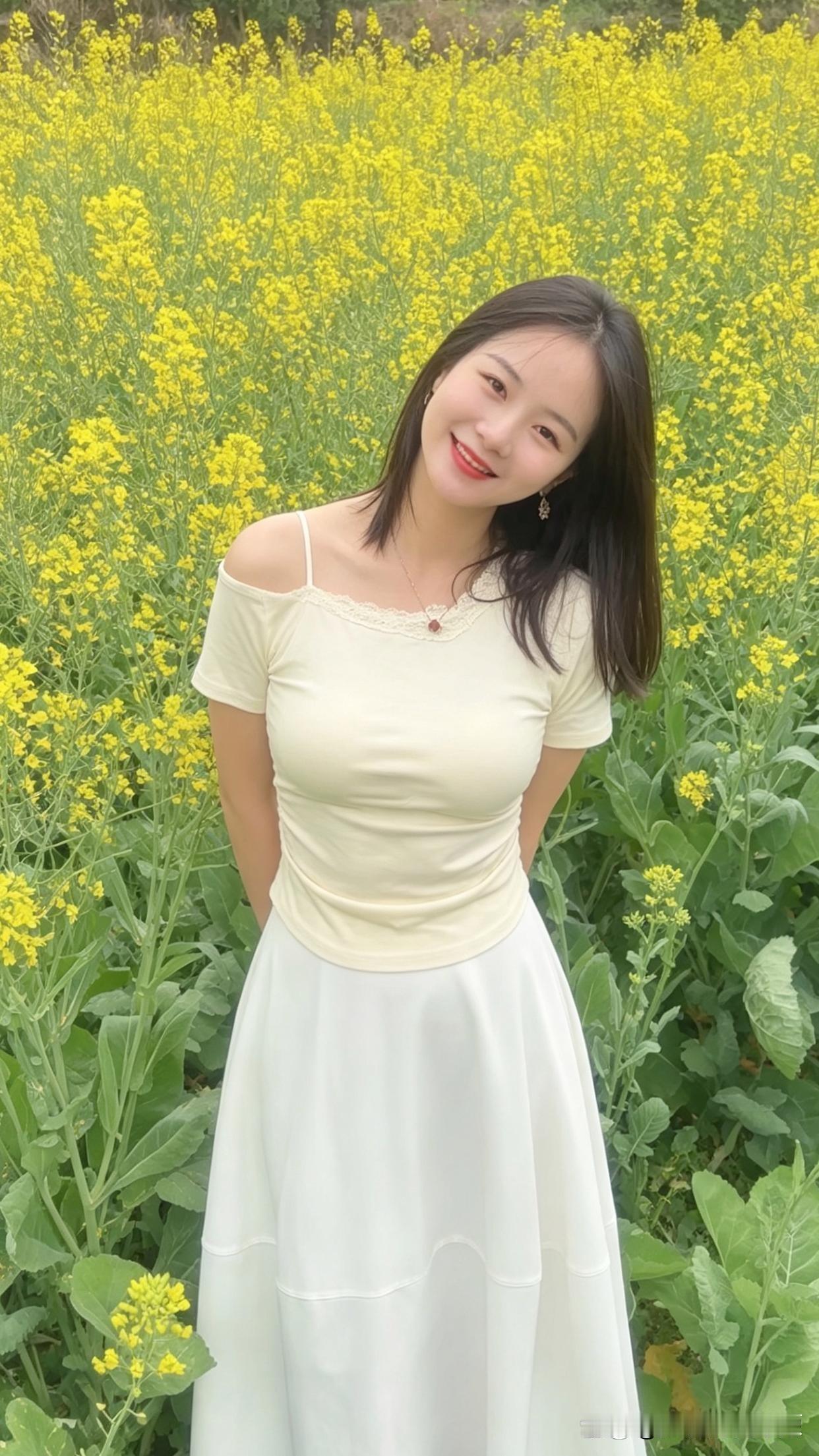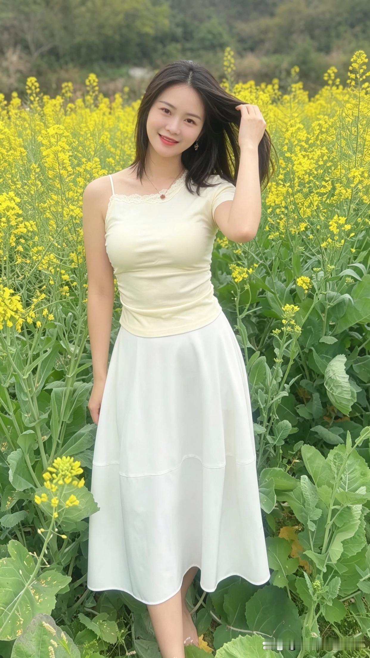 春日花海,是甜美少女的天然舞台。瞧那身着白裙的她,在花丛中笑靥如花,长发随风轻扬