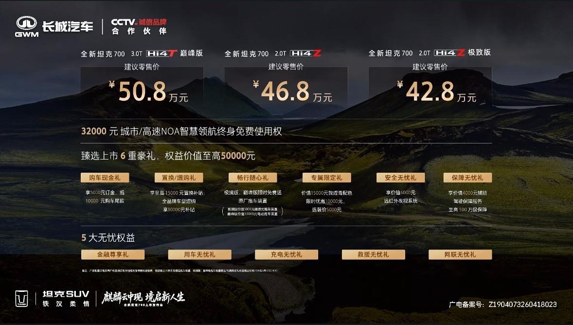 坦克这次同步发布了"百大主理人计划",旅行达人带你去普通游客到不了的地方,开着这车就解锁。售价42.8万元起,上市即交付全新坦克700新时代新旗舰麒麟云中现境启新人生