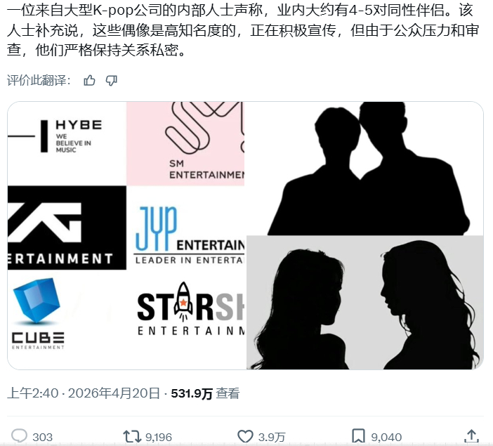 推热转,一位大型Kpop公司内部人士声称,业内大约有4-5对同性伴侣...