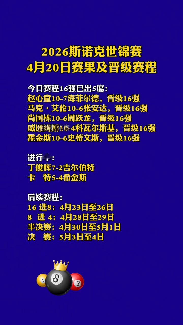 2026斯诺克世锦赛4月20日赛果及晋级赛程。