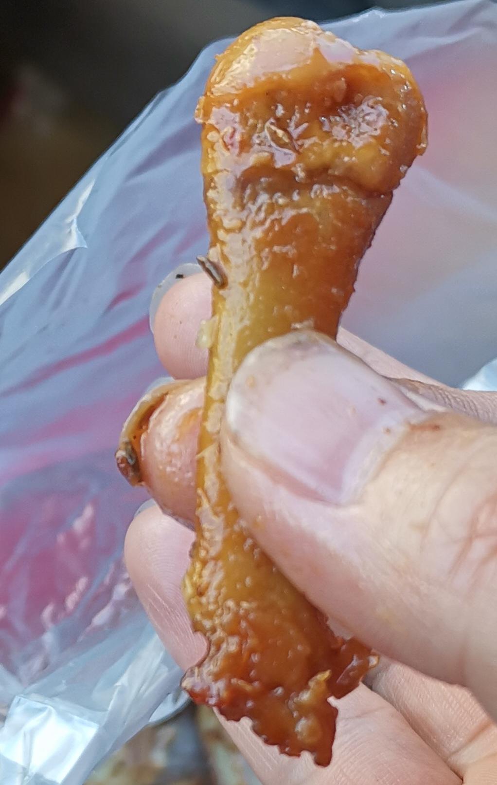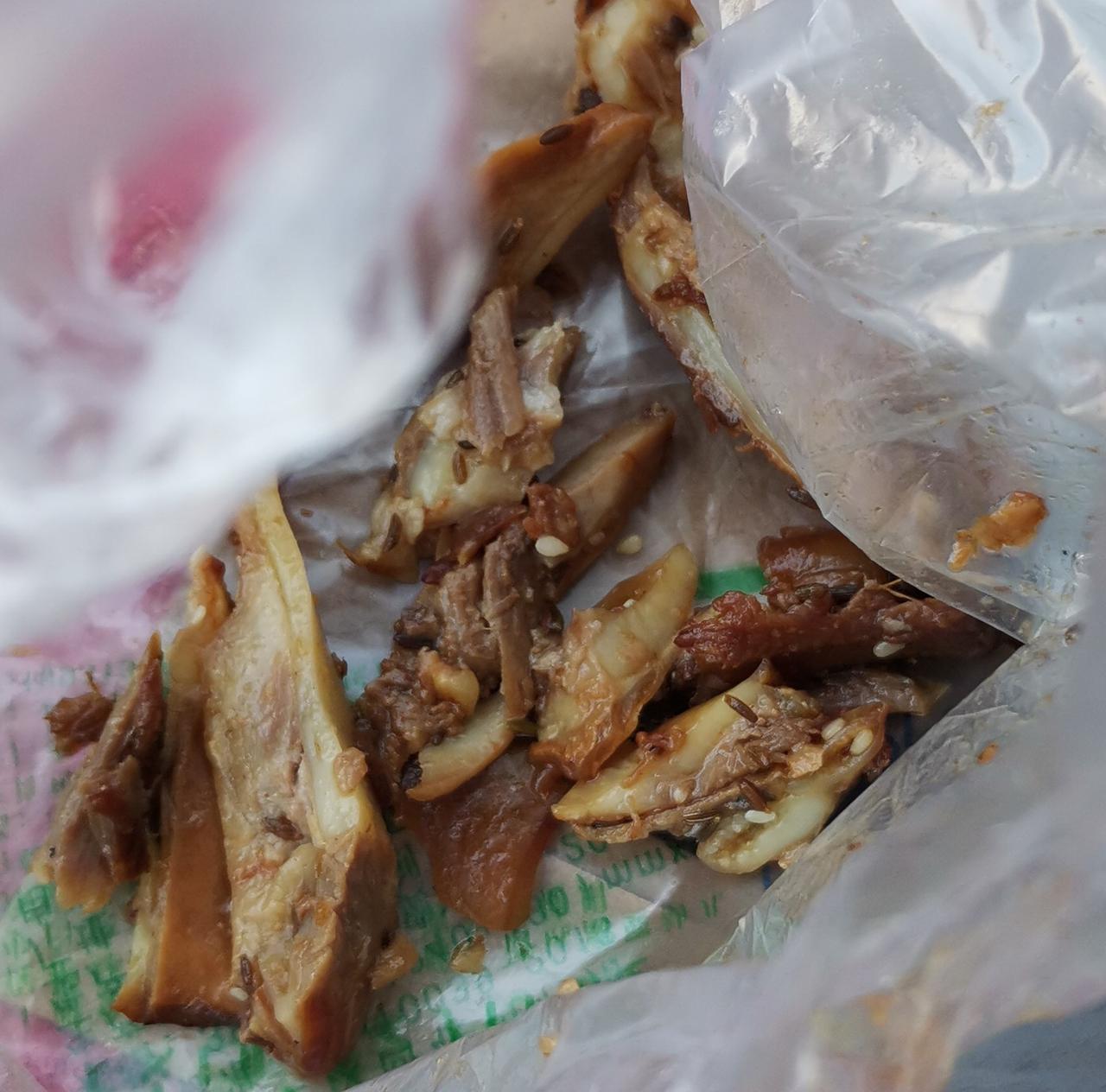 吃了多一半,突然发现,买的猪脆骨中有一根骨头,骨头很干净,上面几乎没肉,心想是不是有人啃过,放里面了?心里开始有点不放心。