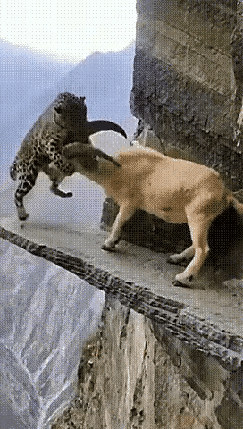 悬崖边的生死博弈 一只岩羊正用角顶撞一只花豹,两者都身处仅容立足的悬崖窄道上,