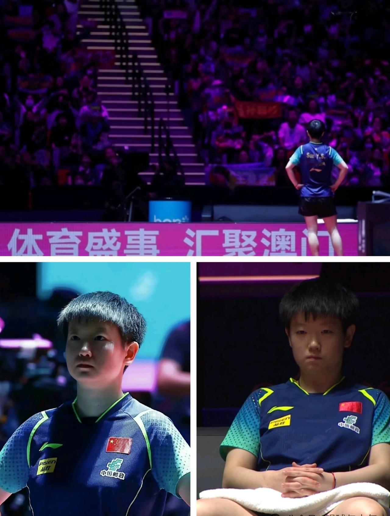 决胜局开打前,全场观众都安安静静的,没人喊加油。大家都看着孙颖莎一个人静静坐着,别看她表面特别淡定,心里压力肯定特别大。