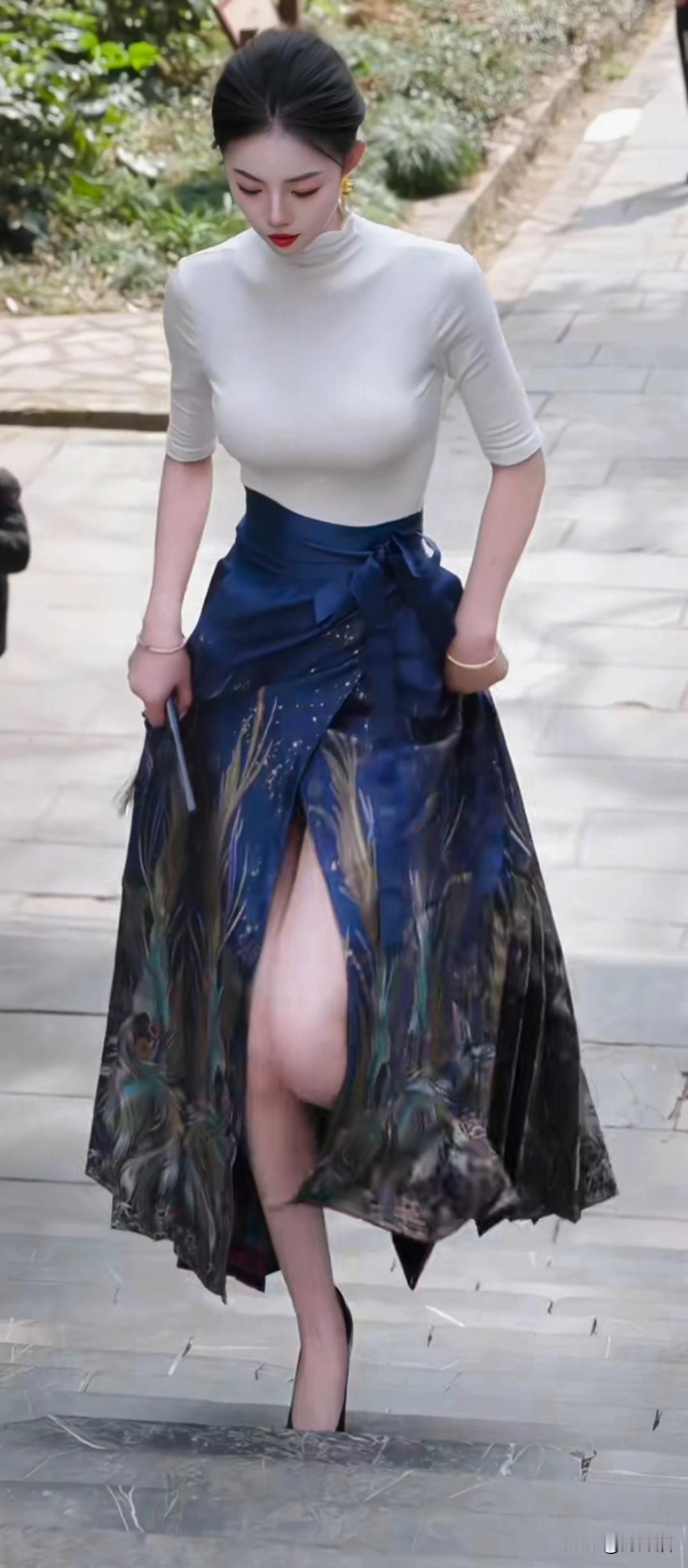 白衫勾勒出简洁利落的线条,宝蓝色马面裙宛如流动的星河。孔雀翎羽在裙裾间舒展,金翠交相辉映,仿佛将千年的东方浪漫织进了布料之中。美女在行走时,裙摆轻舞飞扬,开叉处露出的脚踝与红底高跟鞋相互映衬,将温婉与飒爽平衡得恰到好处。