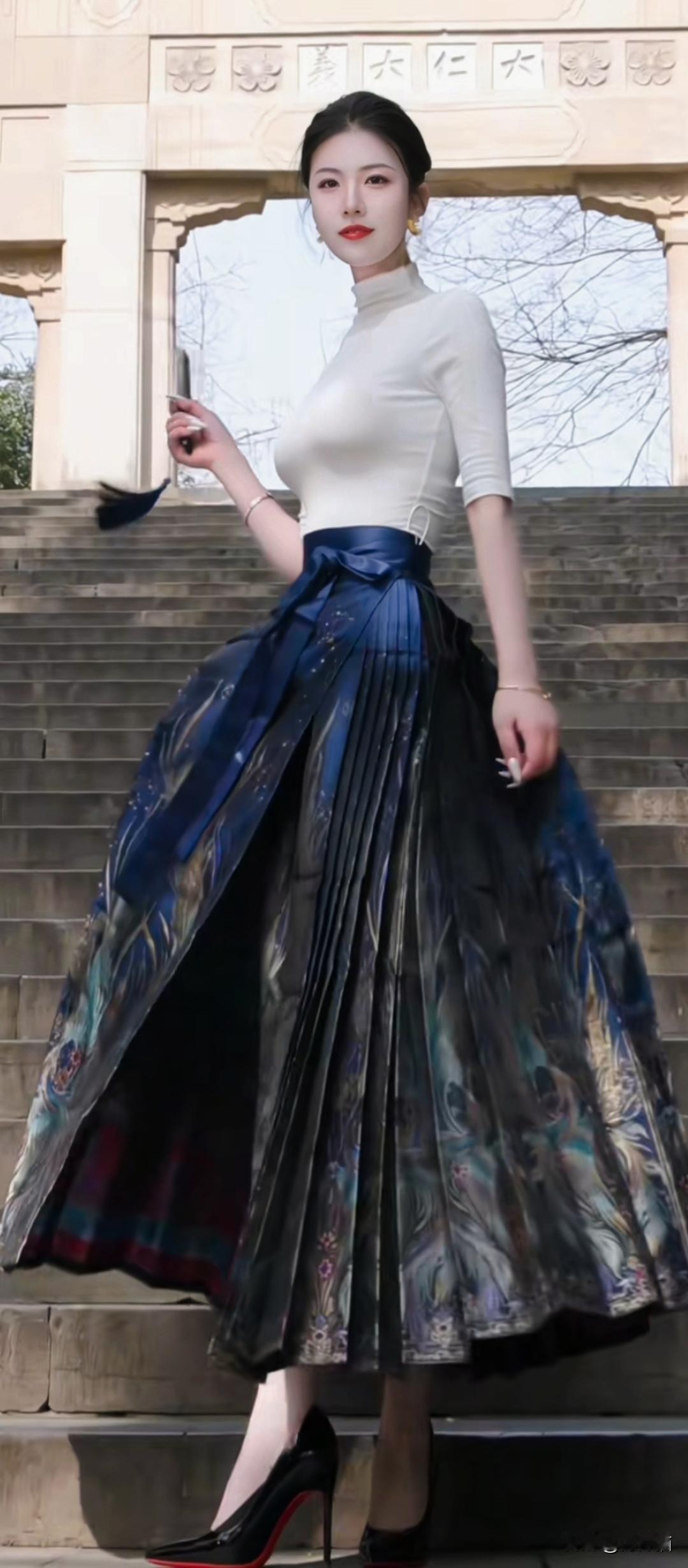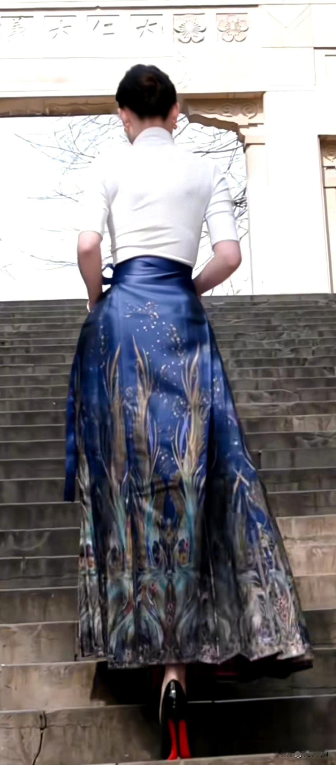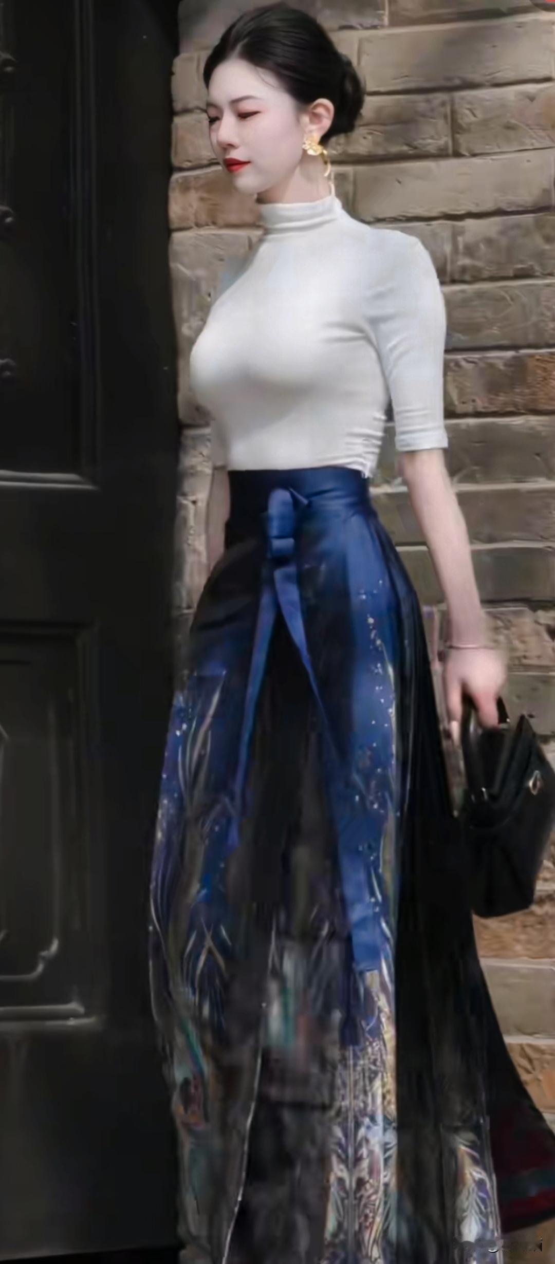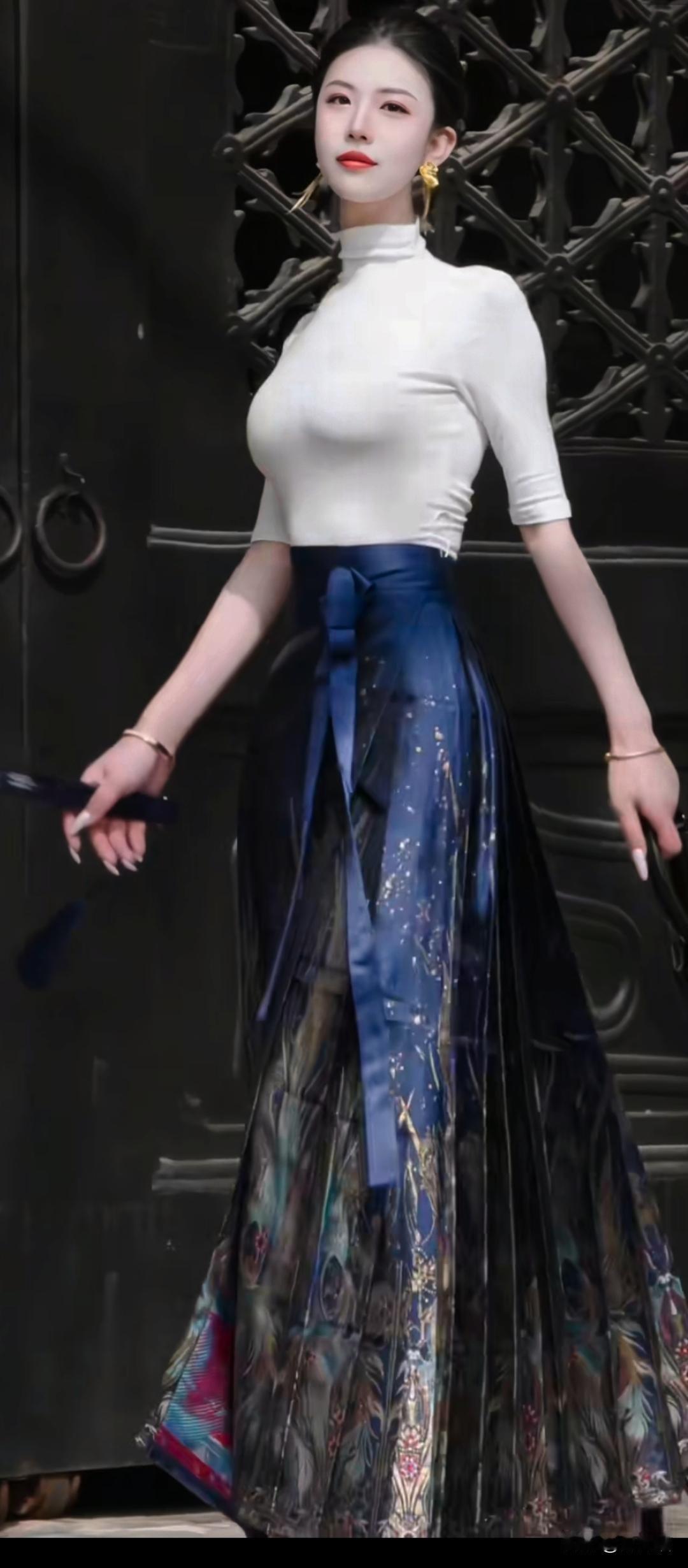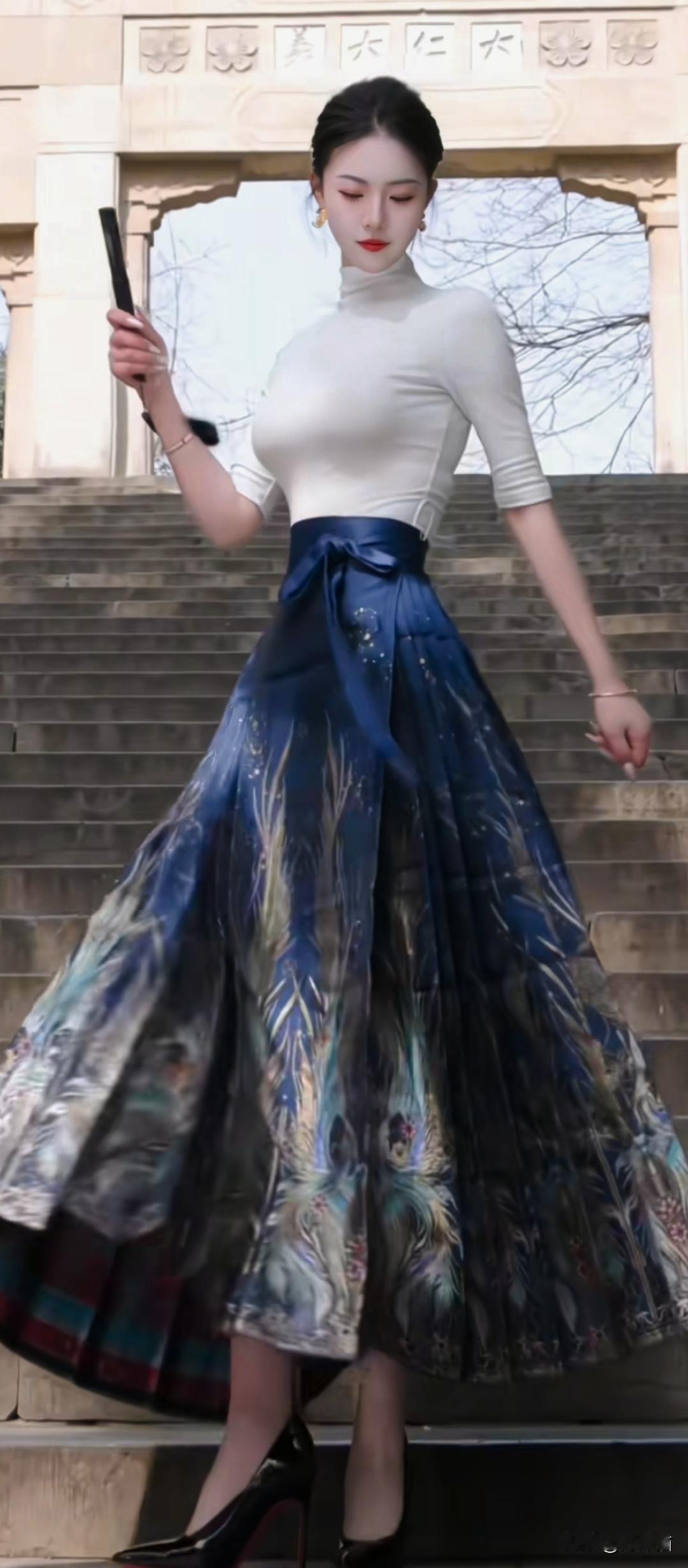 当高领白衫邂逅优雅的蓝色孔雀羽纹马面裙,现代简约与古典风华在她身上实现了一场惊艳的碰撞,尽显高级与时尚魅力。