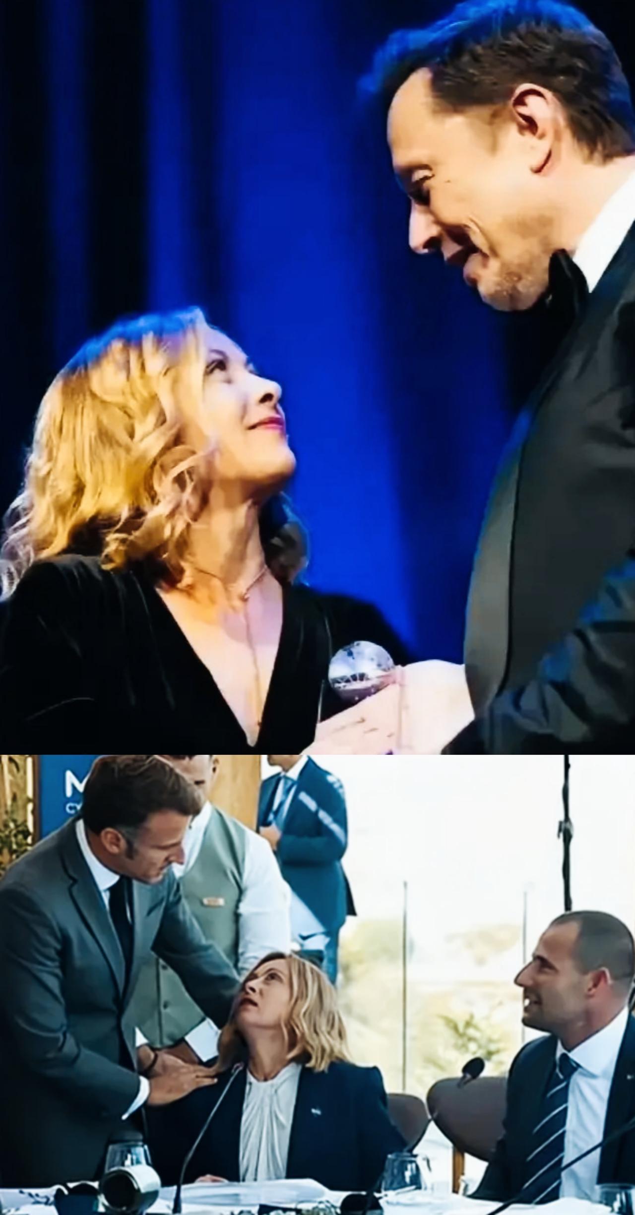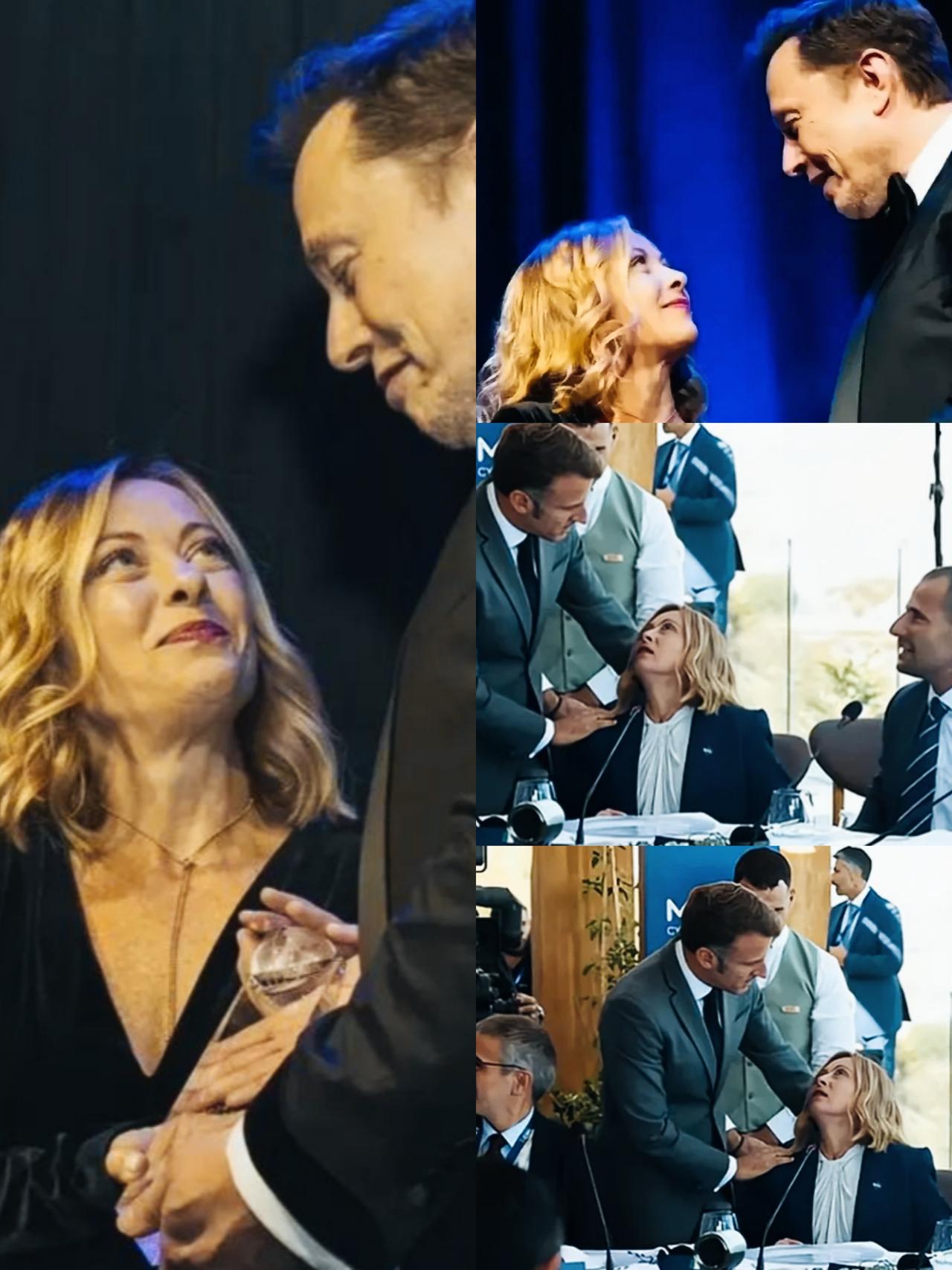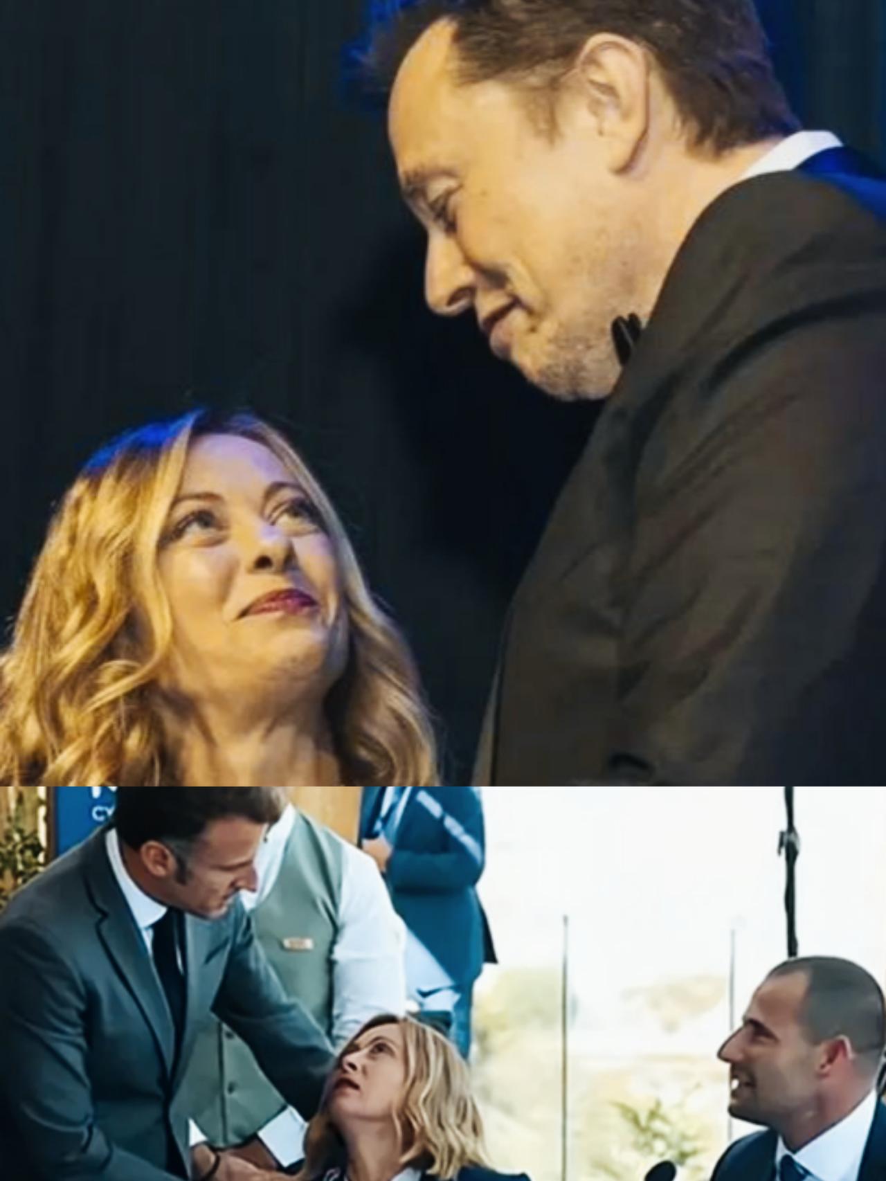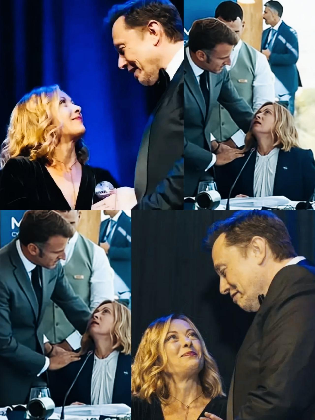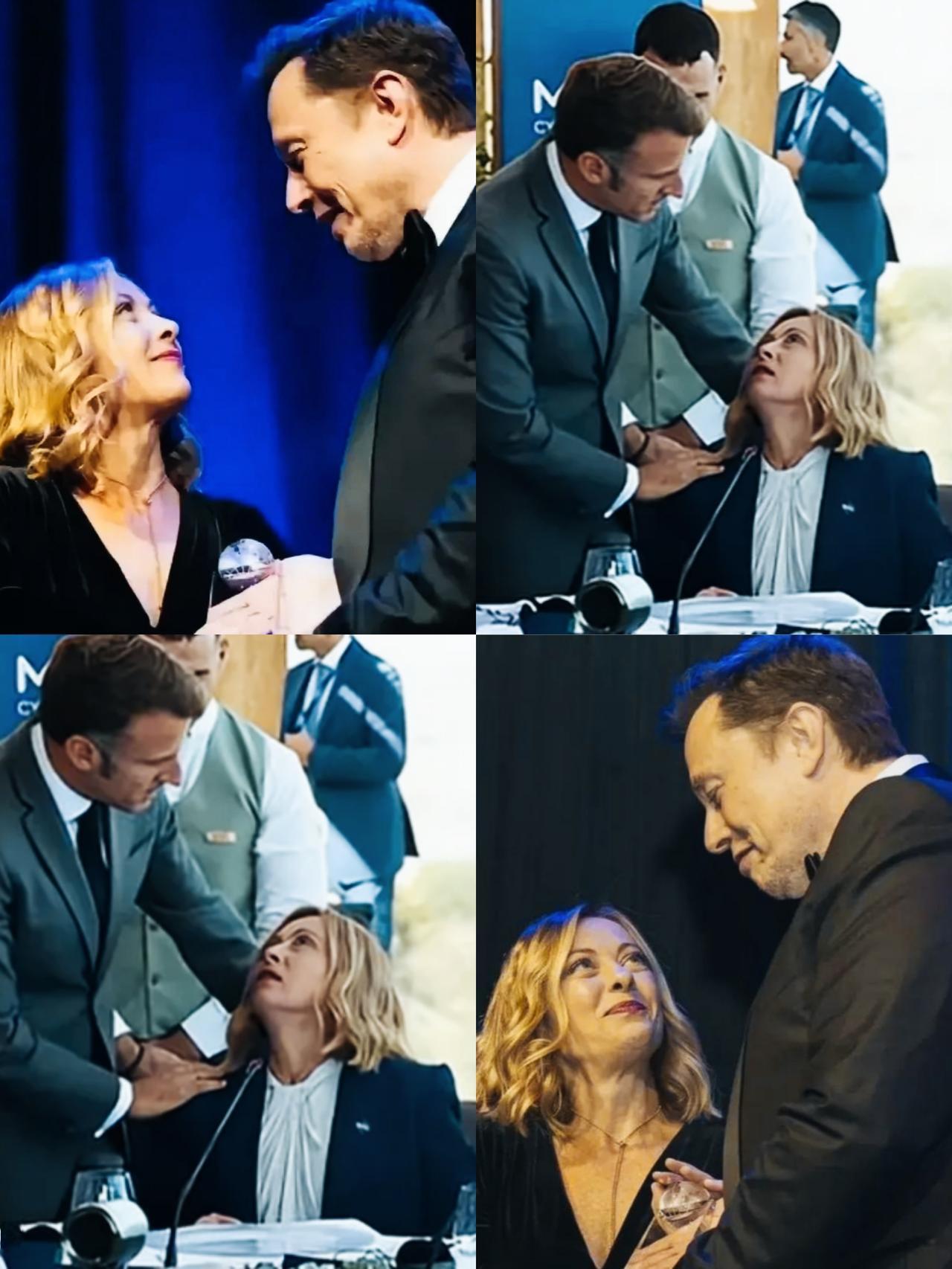 梅洛尼看向马克龙和马斯克时,几乎相同的姿势,却不同的表情和眼神啊!