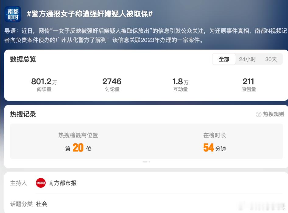 广州警方通报警方通报女子称遭强奸嫌疑人被取保 还原事实获舆论认可4月中旬,广州一女子通过抖音号“世界会有光”持续发视频称,“2023年6月我遭遇强奸后报警,警方已立案,但男方却能跑到国外。男方在取保期间持续对我实施网暴与诽谤,致使我患上重度抑郁和焦虑,甚至多次轻生。”4月16日,海报新闻报道称,广州杨女士称其遭遇强奸后,对方在刑拘14天后被取保候审,案子至今仍未有结果。办案民警表示,案件已调查完,具体案情不方便透露。部分网民不满警方回复,质疑“男方有保护伞”“警方包庇”4月17日,南方都市报采访负责案件侦办的广州从化警方,报道事件来龙去脉。据报道,2023年6月24日,从化警方接杨某(女,案发时38岁)报警称被其前夫曾某(男,案发时40岁)在从化区一酒店内强奸。警方于当日依法将曾某传唤至公安机关开展调查。经初步证据收集,2023年7月13日从化警方对曾某涉嫌强奸立案侦查,并于同日依法对曾某采取刑事拘留强制措施。经警方进一步调查,双方于2010年相识,次年依当地习俗举办婚礼并育有一子。后续虽因家庭矛盾分居,曾某长期在境外生活和工作,但因需共同抚养儿子,双方仍保持联系。经审讯,曾某供述自2023年2月回国后,与杨某长期保持密切关系,且承认在6月24日凌晨与其发生性关系,但均系双方自愿,无暴力胁迫行为。经询问与2人同房居住的儿子,其称未听见、看见杨某有呼喊、反抗等异常情况。经法医检查,未发现杨某有身体损伤。对于发生性关系的行为是否违背杨某意愿,双方各执一词,杨某的指控无其他证据印证。当事女子长期在社交平台发声,单方描述“被强奸”“嫌疑人仅拘留14天后就被取保”“男方跑到国外”等情节,引发部分网民关注。媒体介入报道后,舆论关注度迅速攀升。起初,公众出于对“受害者”的同情,对警方办案流程、执法公正产生质疑。警方前期回应称“案件已调查完,具体案情不方便透露”,较为模糊,引发网民猜测。后续警方及时披露详细调查结果,有效扭转舆论走向。粤港澳大湾区