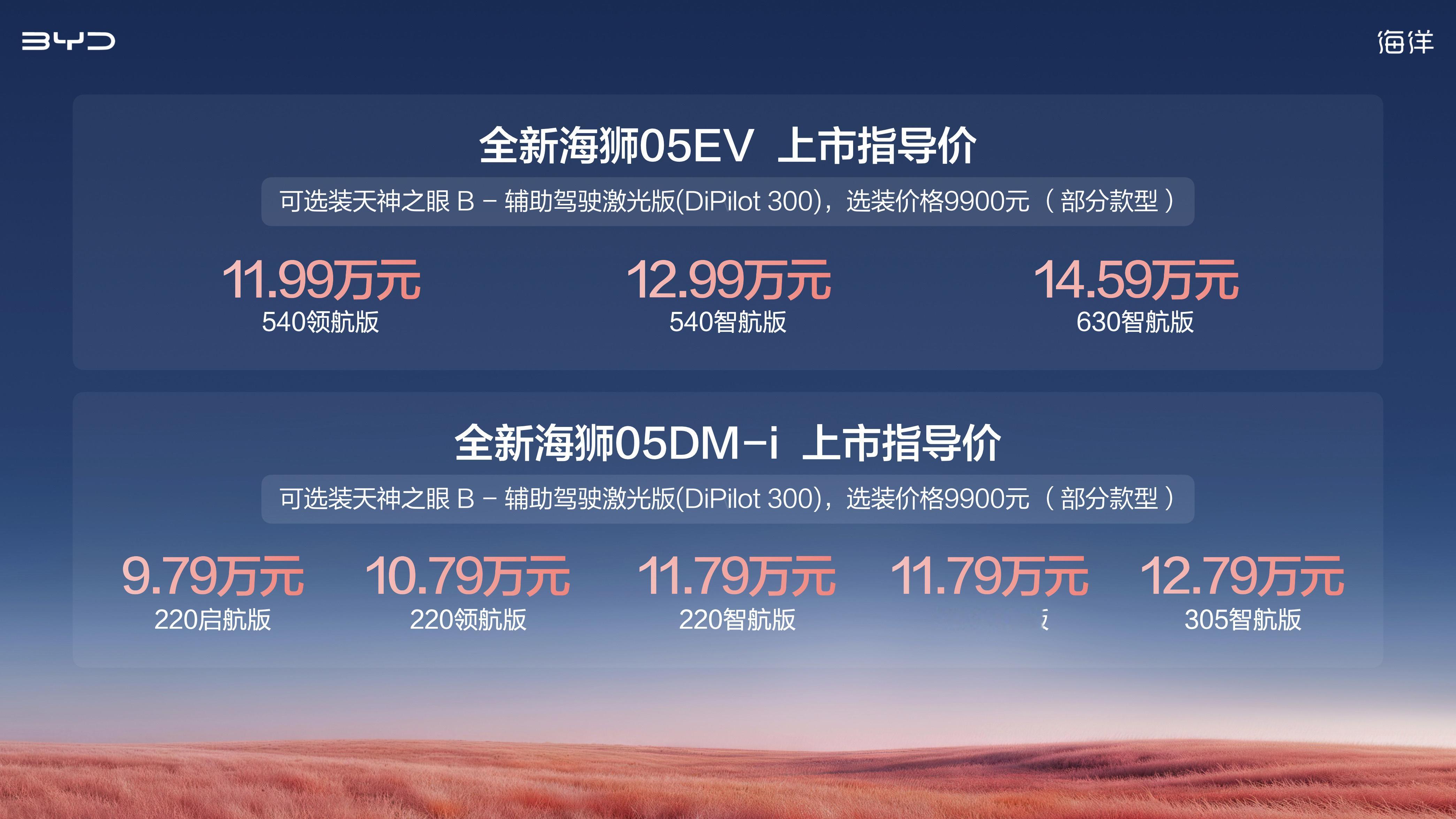 全新海狮05昨晚公布价格,9.79万元到14.59万元。纯电版11.99万起,插混版9.79万起。