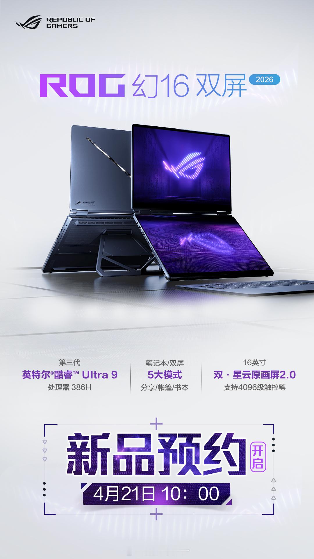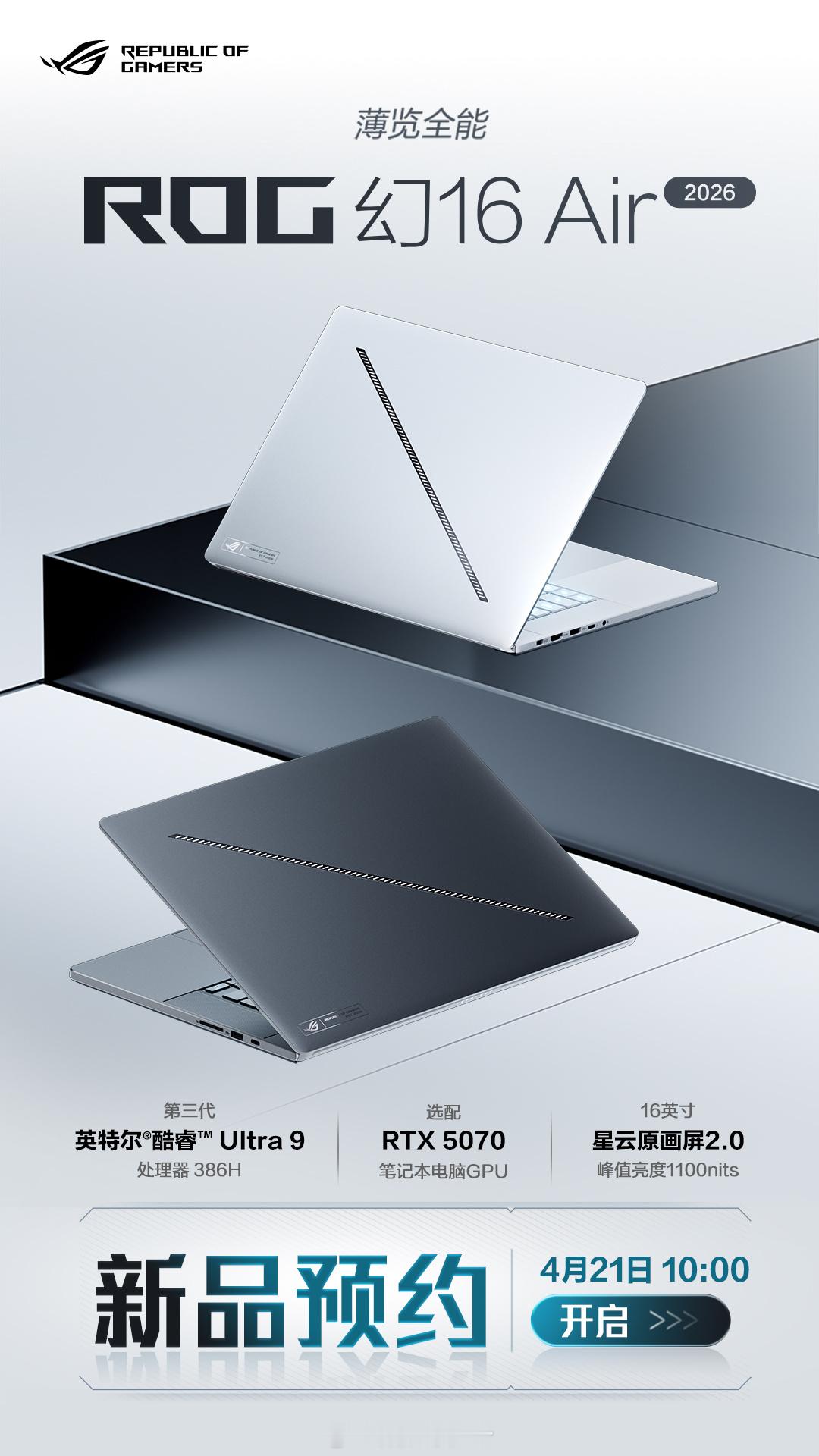 16英寸双大屏旗舰全能本 ——ROG幻16双屏,正式登场。至高搭载RTX 5090与Ultra 9 386H 处理器。五大形态自由切换,转轴开合之间,从创作台、演示屏到监看中枢,角色随心定义,一机多能,定义“背包里的移动工作站”。ROG 幻14/16 Air 2026专业性能轻薄本同步登场,极致轻薄,性能不妥协。即刻预约,锁定你的移动生产力旗舰。