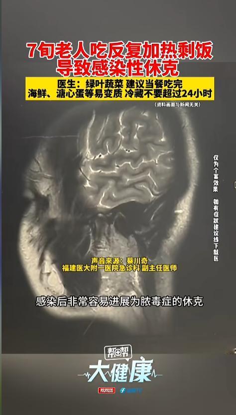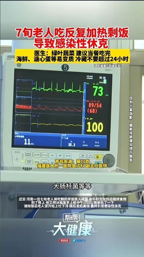 信息来源:《第823集:7旬老人吃反复加热剩饭 导致感染性休克 医生:绿叶蔬菜 建议当餐吃完 海鲜、溏心蛋等易变质 冷藏不要超过24小时》第一帮帮团