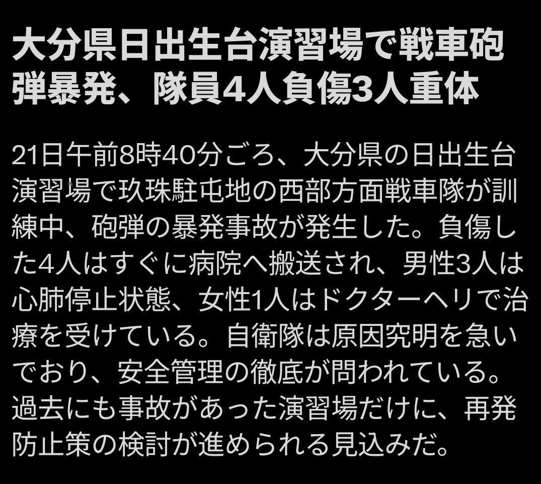 日本坦克爆炸导致4人重伤,其中1人还是女兵!就这还想干涉台海?2026年4月21日上午8时左右,日本大分县日出生台演习场突然接到“坦克爆炸”紧急通报,日田玖珠广域消防本部迅速出动,4名伤者被紧急送医,其中3名男性已陷入心肺停止状态,1名女性伤势严重。现场情况目前仍未完全公开,但初步信息显示这是一起发生在陆上自卫队西部方面战车队训练过程中的意外事故,事故原因可能涉及火炮或弹药系统故障,目前所有训练活动已暂停,事故调查委员会正在紧急组建。日出生台演习场作为西部方面战车队的核心基地,过去几年已多次发生训练伤亡,包括2025年两名20多岁三等陆曹在侦察潜入训练中因雷击身亡的案例,说明该区域地形与天气因素叠加,容易放大装备或操作风险。真正值得深思的是,自卫队近年来频繁扩大联合演习规模,却在基础安全培训和装备维护上是否跟得上节奏?类似事件如果频繁发生,不仅会影响部队士气和招募意愿,更可能让民众对“防卫力强化”产生质疑。就这实力还想干涉台海,日本右翼的军事膨胀,可能更多是在幻想中,而不是在军事准备上……