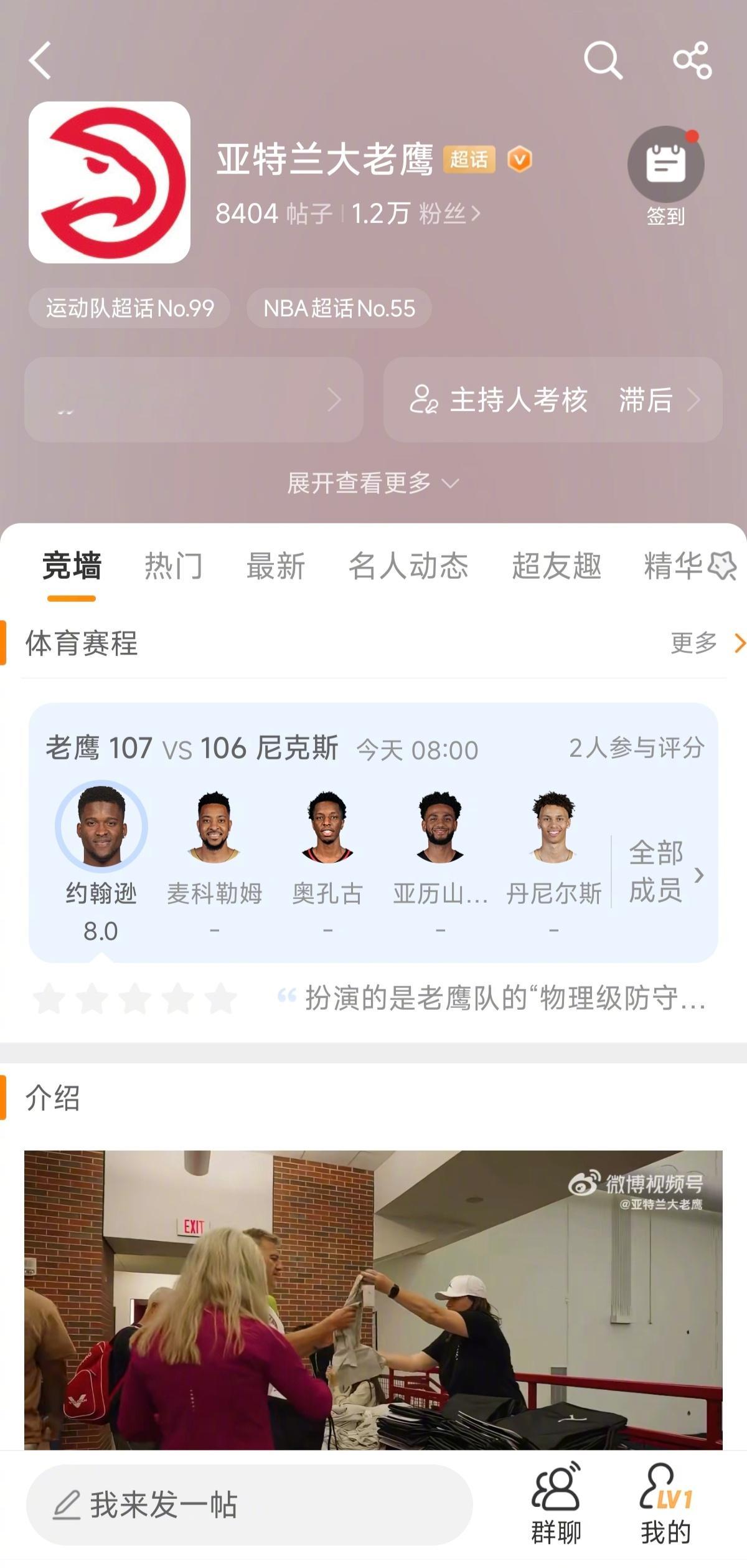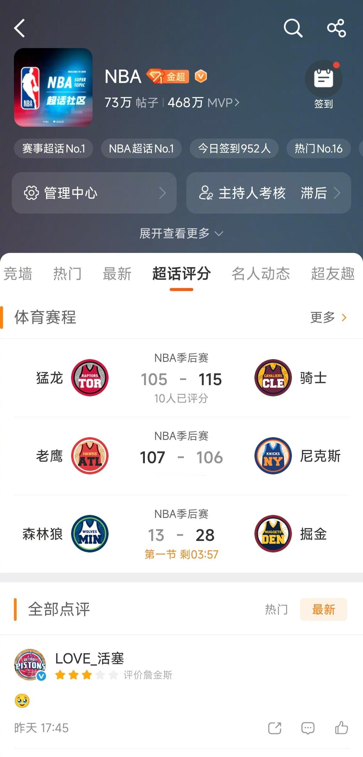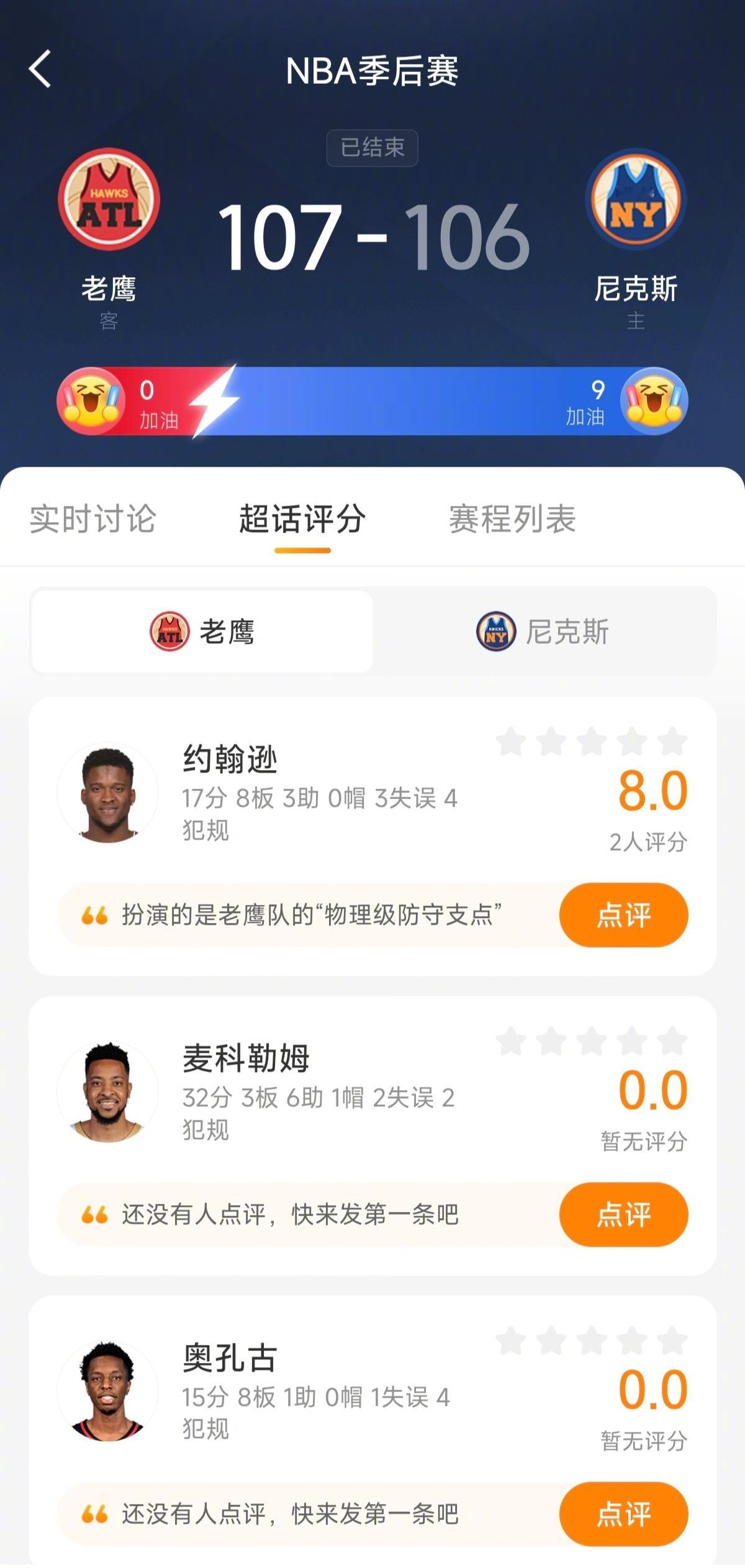 老鹰1比1尼克斯骑士2比0猛龙 来超话为球员本场比赛表现点评评分,参与nba季后