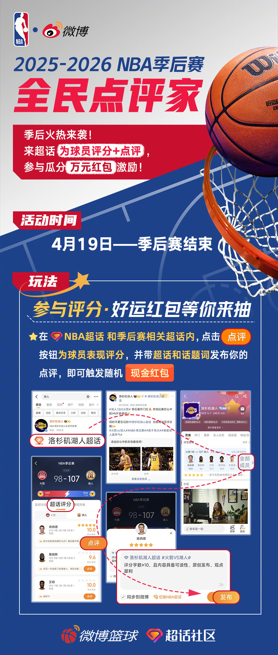 来超话为球员本场比赛表现点评评分,参与nba季后赛全民点评家 ,有机会抽取随机现金红包!神评还有机会获得额外激励~