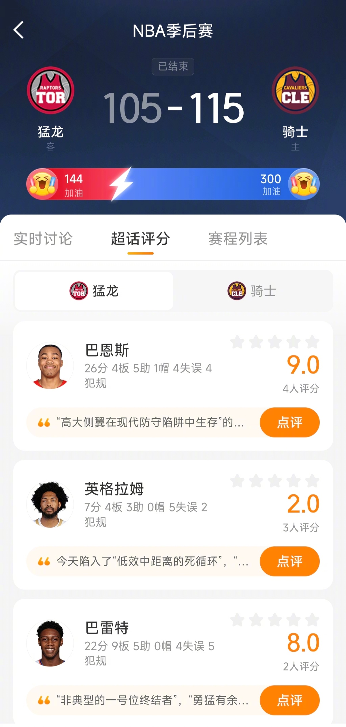 NBA季后赛骑士主场对阵猛龙的比赛已经结束。全场战罢,骑士以(2)115-105