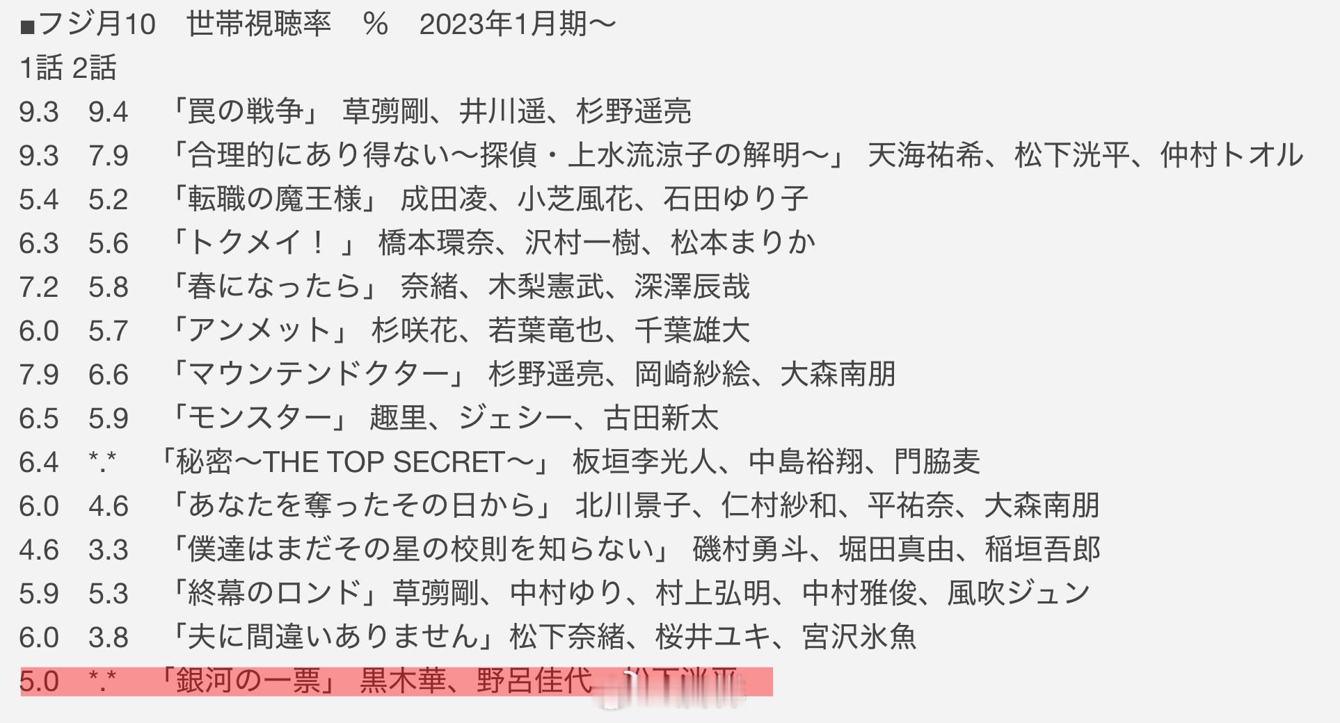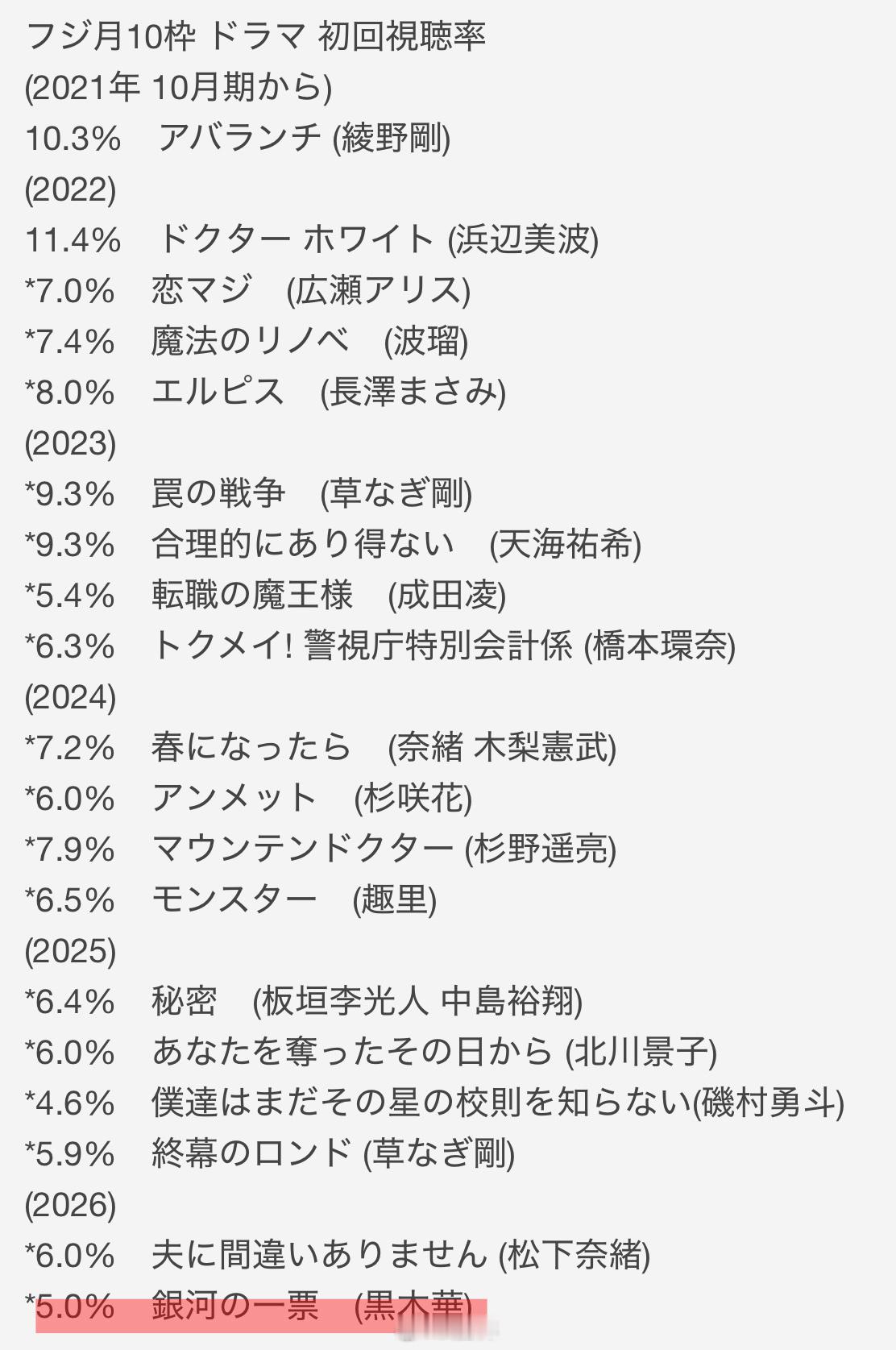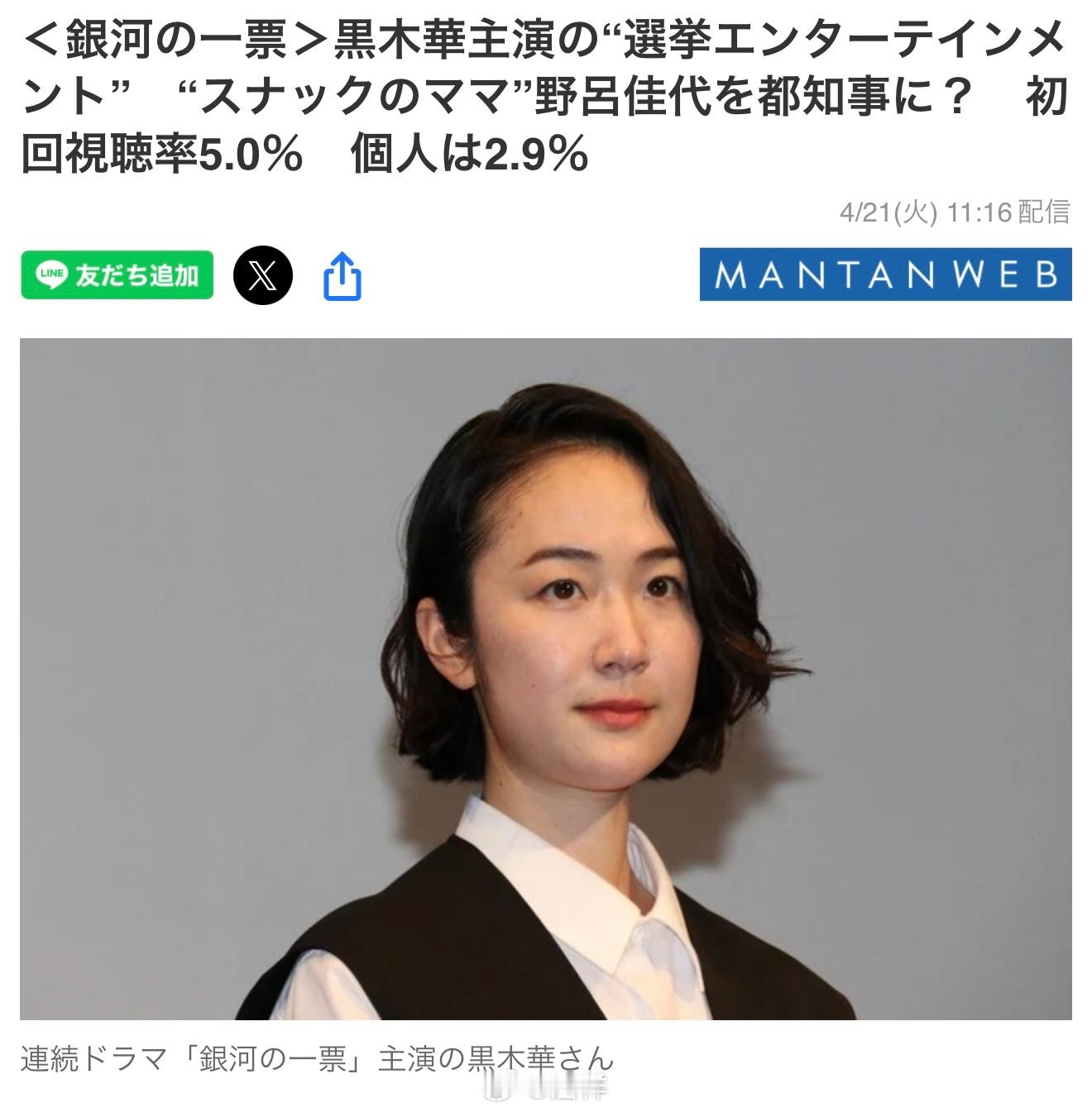 新剧开播:女演员黑木华(36)担任主演的富士台月10连续剧『银河一票』第1集于4月20日播出。据调查,平均收视率为世代5.0%、个人收视2.9%。