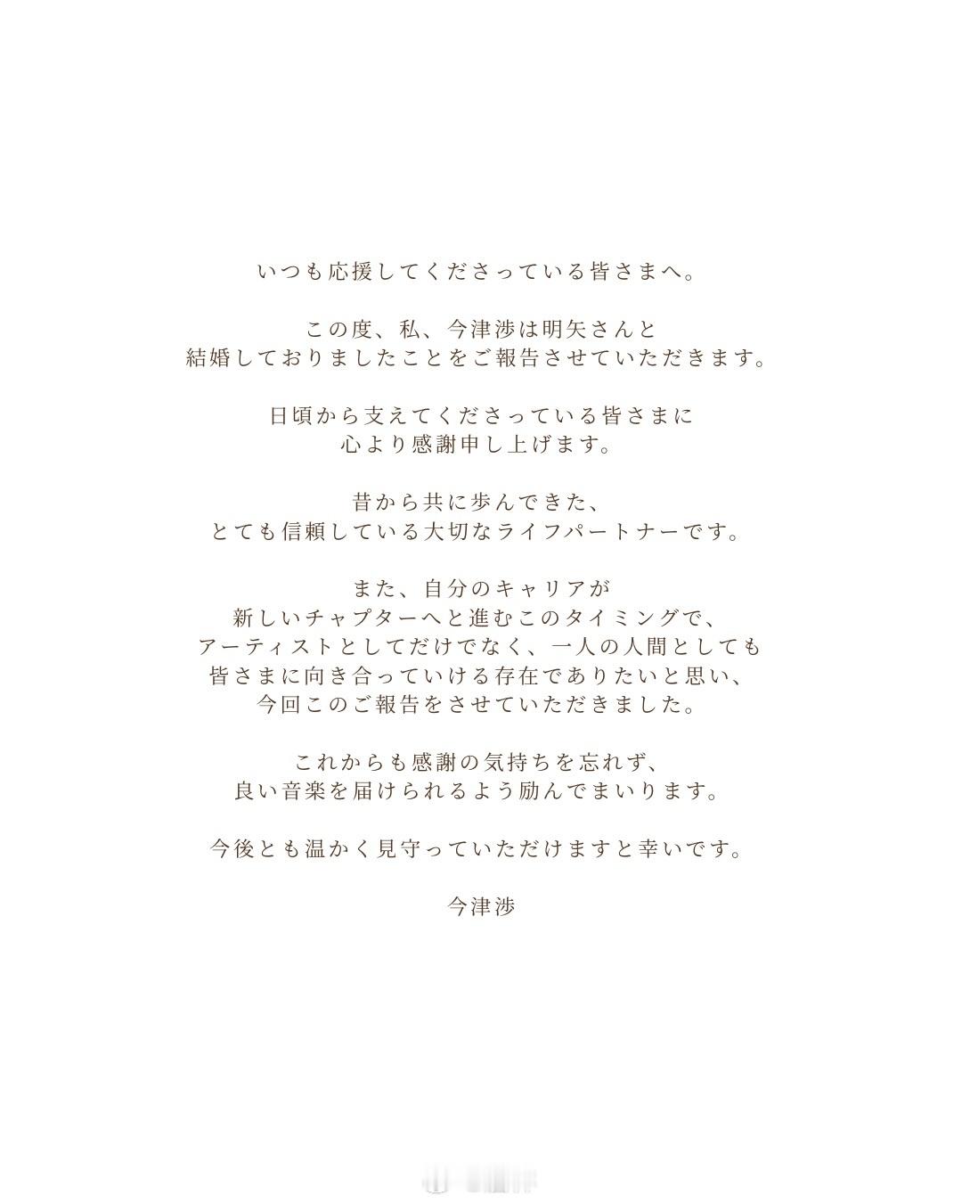2024年凭借单曲「Obsessed」获得日本唱片大奖企划奖的创作男歌手今津涉(Ayumu Imazu)于本日更新个人INS宣布与女艺人明矢结婚。今津渉同时作为舞者、编舞师活跃,是引领Z世代的艺人。2021年主流出道,自行负责作词、作曲与编曲。2024年1月发行的「Obsessed」被SEVENTEEN等韩国人气组合接连翻跳并发布舞蹈视频,在海内外引发巨大反响,并于同年获得日本唱片大奖企划奖。