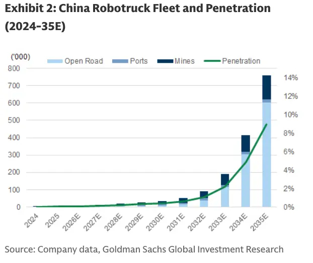 高盛的逻辑是,Robotaxi的渗透是"城市共享出行内部替代",而RoboTruck的渗透是"整个公路货运体系的渐进改造"。