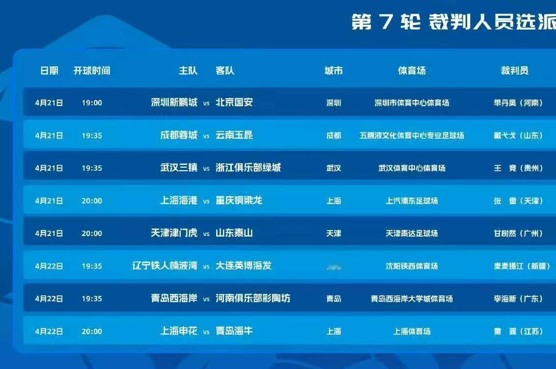 中超联赛第七轮今晚全面开赛,上午足协公布了本轮联赛的裁判员名单,其中备受关注的辽