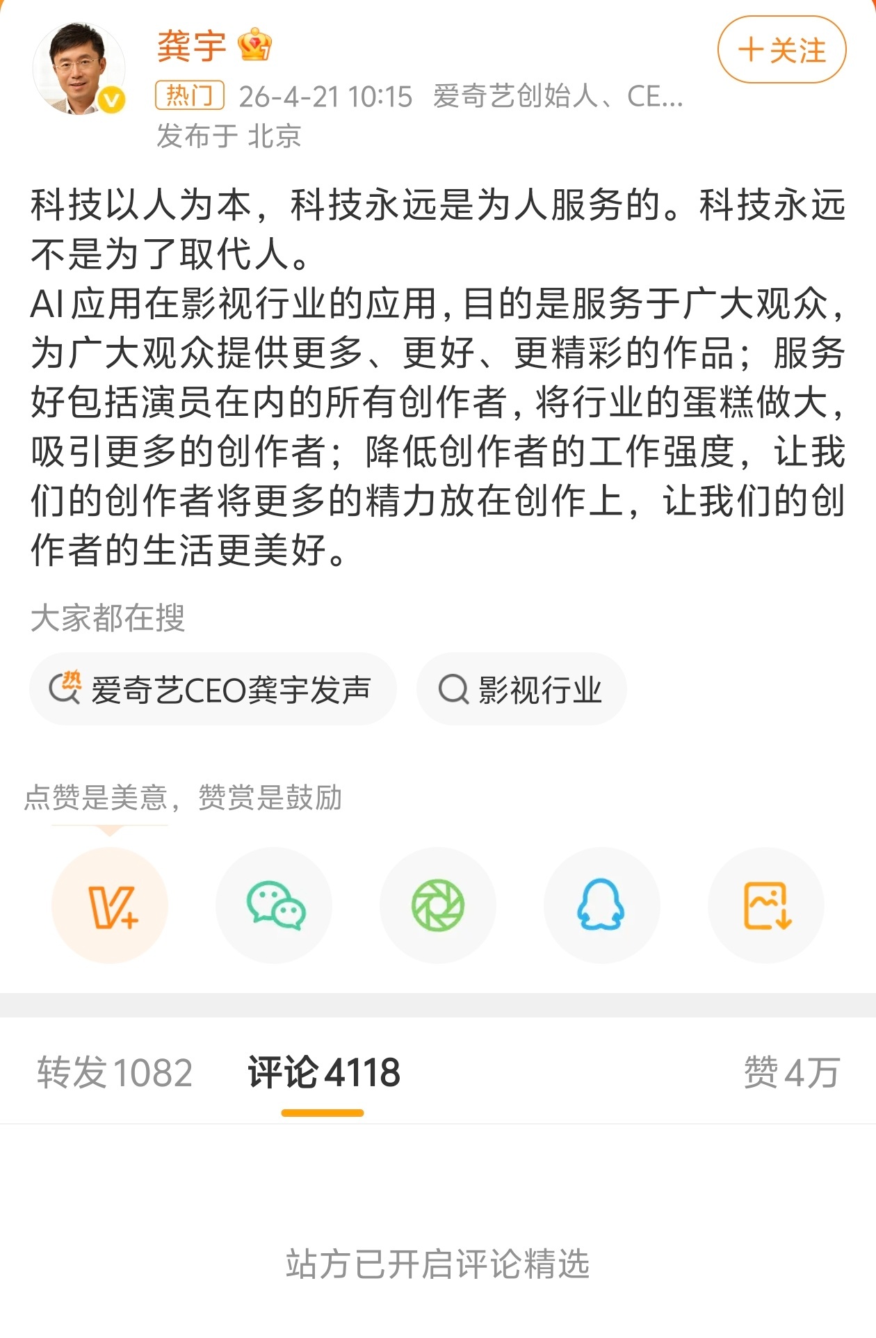 爱奇艺CEO龚宇发声爱奇艺 傲慢这份发声反而让网友们炸了,“资本的傲慢” 我们要的是人类真情实感的表演而不是冷冰冰的Ai。