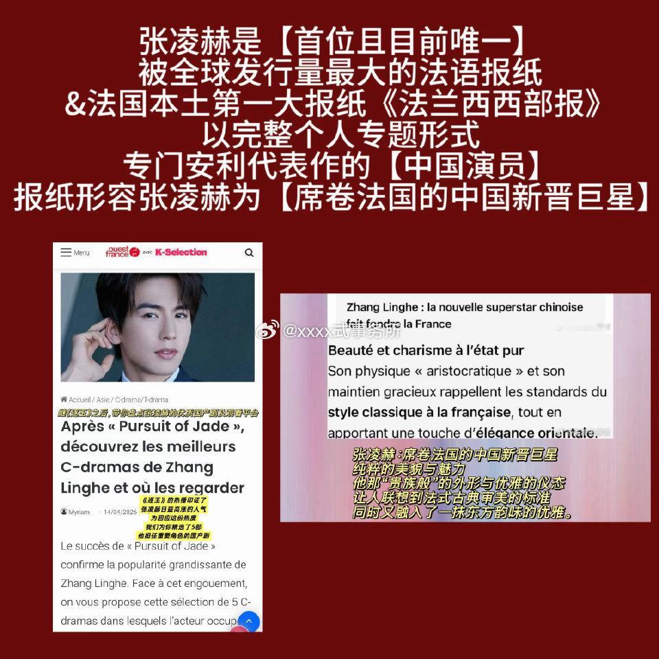 《法兰西西部报》,为张凌赫专门发文设立了专题安利!形容凌赫为【席卷法国的中国新晋巨星】这是全球发行量最大的法语报纸,也是法国发行量最高的付费日报【法国本土第一大报纸】,张凌赫是【唯一】一个被法国第一大报纸《法兰西西部报》完整个人专题形式专门安利代表作的【中国演员】