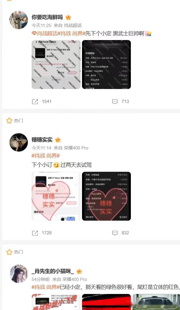 数据女工们发力了…希望各位说到做到啊,真需要买车代步的这车当然可以买,从预售价看这车性价比应该蛮高。当年博子哥的奥迪联名A3大家是真抢着买单的,我记得带亲签的版本溢价到70多万,那几乎是一台RS3的价格了。这次可别到时咔咔退订搁这娱乐大家了肖战 尚界尚界z7预售价格22.98万起我与汽车的日常