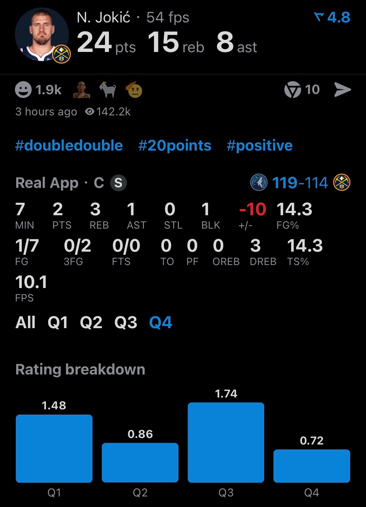 约基奇和穆雷第四节表现:4分,12投2中,三分4投0中