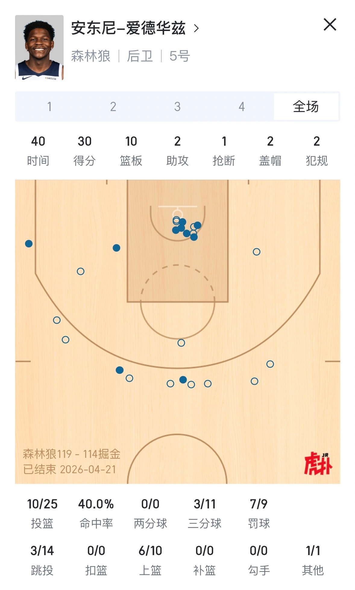 球星有担当!爱德华兹“跑步膝”带伤作战。40分钟30分10板2助攻2盖帽!森林狼vs掘金