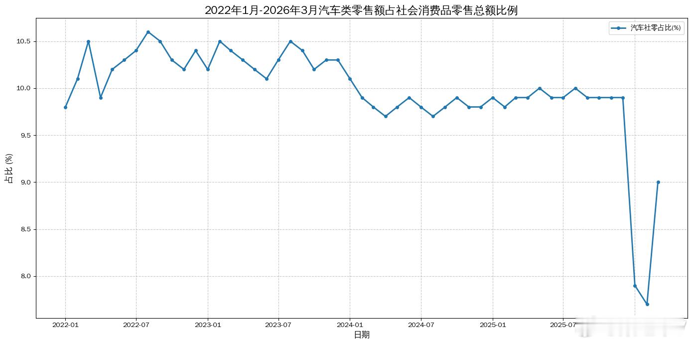 汽车类零售额占社会消费品零售总额比例表!今年一季度是历年最低!桑之未汽车行业观察