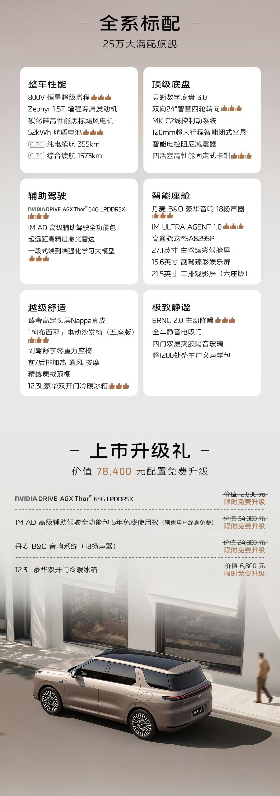 这是最好评的一点,没有传统车企高低配阉割核心配置的套路,咔咔上来就是标配,恒星超级增程、双向24°智慧四轮转向、智能闭式空悬、520线激光雷达+英伟达Thor芯片、IM AD辅助驾驶,还有丹麦B&O音响、12.3L双开门冷暖冰箱、4D机械按摩座椅,全部标配。